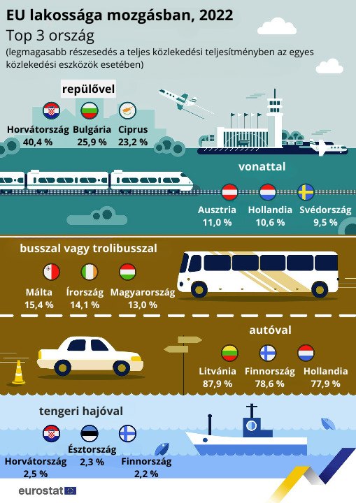 Ez alkalomból hoztunk egy infografikát, amelyen az látható, hogy 2022-ben az Európai Unió lakossága milyen mértékben használta a különféle közlekedési eszközöket.