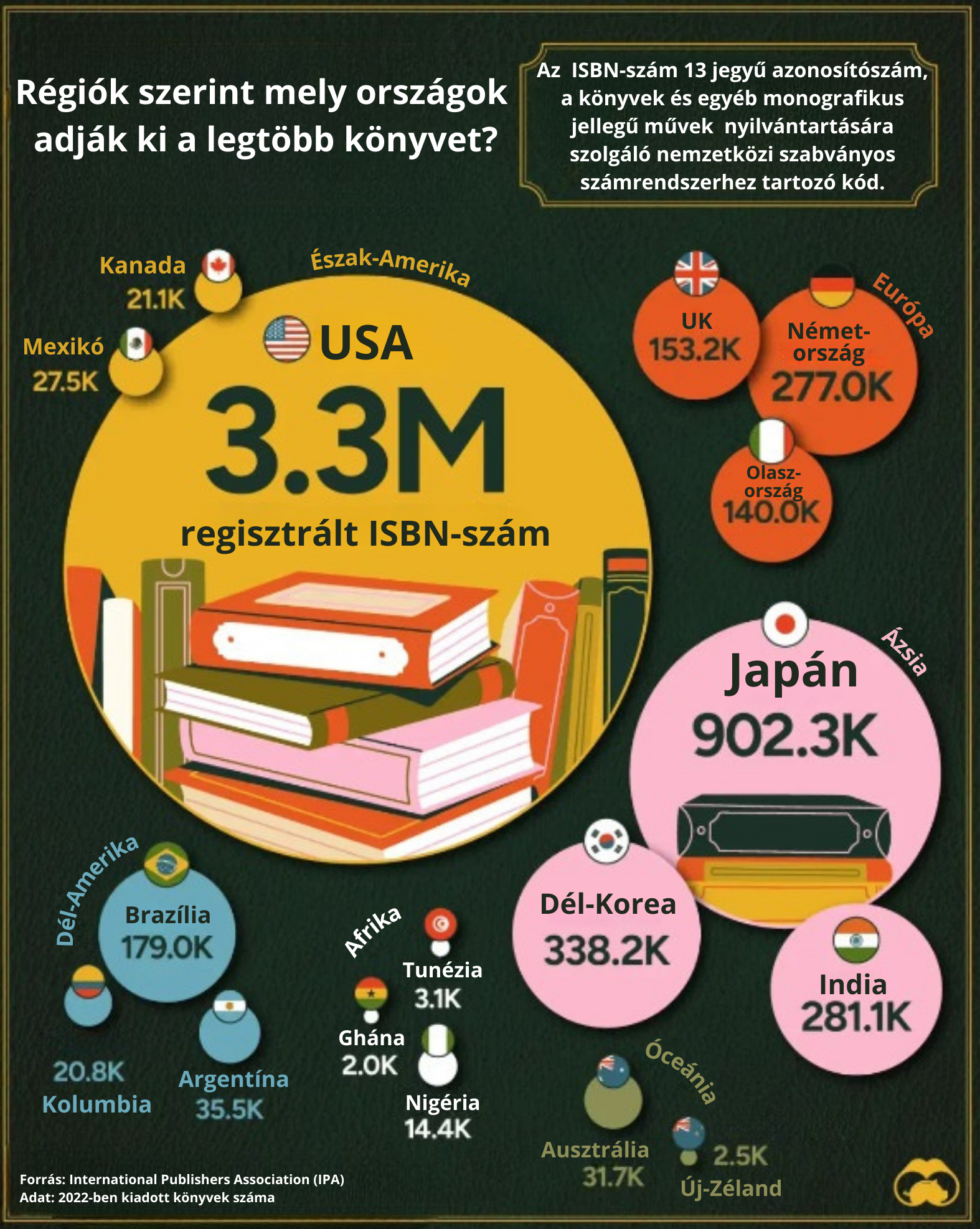 Az Egyesült Államok messze a világ legnagyobb könyvpiaca, 2022-ben közel négyszer annyi ISBN-t regisztráltak itt, mint a második helyen álló Japánban.