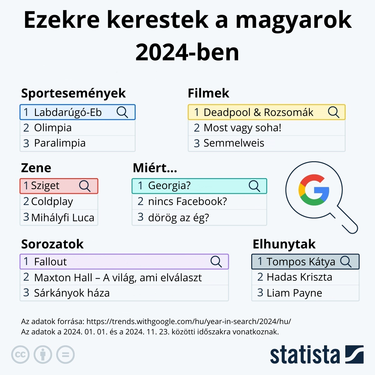 A Google idén is közzétette a „Year in Search” keresési listáit, amelyek ismertetik, hogy 2024-ben mik voltak a legnépszerűbb keresések Magyarországon és a világ többi részén. Az alábbi infografikán látható, hogy hazánkban a múlt évben a legtöbben a különböző témakörökben mikre kerestek rá.