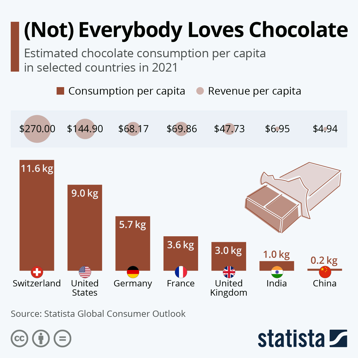 Nem meglepő módon a csokoládéevést illetően Svájc áll az élen, 2021-ben az egy főre jutó éves fogyasztása 11,6 kilogramm volt. A listán az alpesi országot az Egyesült Államok követi fejenként 9 kilogrammal, míg Németországban a becslések szerint átlagosan 5,7 kilogramm, Magyarországon pedig csak 3,3 kilogramm csokoládét esznek meg évente. A Statista szerint a skála másik végén, Indiában és Kínában lényegesen alacsonyabb az egy főre jutó csokoládéfogyasztás: 1,0, illetve 0,2 kilogramm.