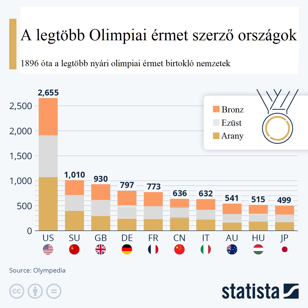 Amint azt az Olympedia honlapja által összeállított adatok mutatják: az Egyesült Államok 1896 óta nyerte a legtöbb érmet a nyári olimpián. Az amerikai sportolók összesen 2655 érmet nyertek – 1070 aranyat, 841 ezüstöt és 744 bronzot.