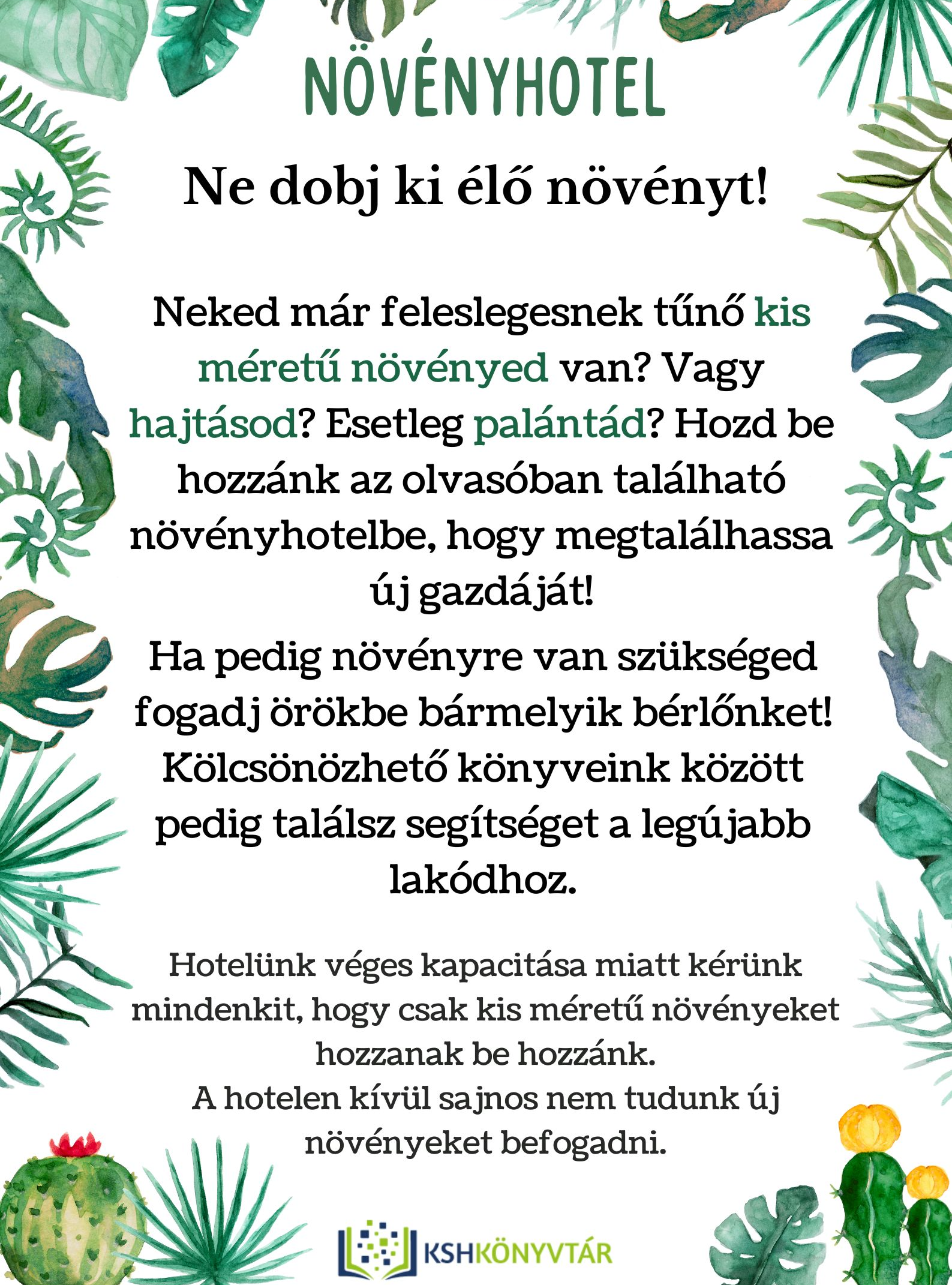 A nyitás alkalmával megnyílt a könyvtár növényhotele is, ahol Olvasóink és Dolgozóink számára lehetőség nyílik arra, hogy a számukra már feleslegessé vált növényeket behozzák, és/vagy más növényt vigyenek el.
