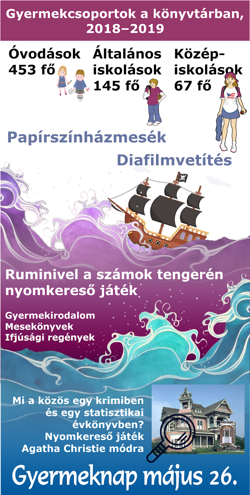 Könyvtárunkat sok gyerkőc látogatja, minden korosztályból. A kisebbek szülőkkel érkeznek, és már szaladnak is hátra, hogy birtokba vegyék a gyermeksarkot, és válogassanak az újabb színes könyvek közül. A nagyobbak már szervezetten is, óvodai és iskolai foglalkozások keretében is érkeznek a könyvtárba. Az óvodás csoportoknak többek között papírszínházmesékkel és diafilmvetítéssel készülnek a  kollégák. Az általános iskolások – a kihelyezett magyarórán – kötelező olvasmányokat ismerhetnek meg játékos formában. A Rumini című regény feldolgozásában egy 12 állomásos nyomkeresés segít. A középiskolákból érkező tanulók egy krimi (Agatha Christie: A három vak egér) alapján igyekeznek minden állomást sikeresen teljesíteni, a válaszok némelyikét egy-egy statisztikai kiadványban találják meg. A játék végén, amikor kinyílik a  kincset rejtő bőrönd lakatja, sok-sok boldog gyermekarcot látni. Kell ennél több?
