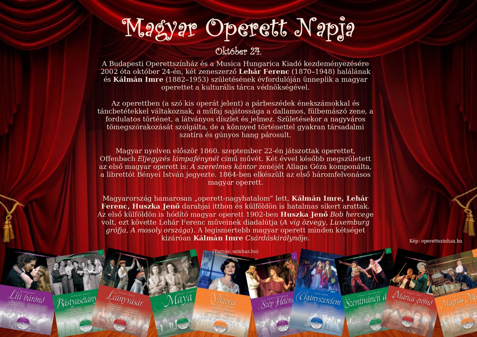 A Budapesti Operettszínház és a Musica Hungarica Kiadó kezdeményezésére 2002 óta október 24-én, két zeneszerző Lehár Ferenc (1870–1948) halálának és Kálmán Imre (1882–1953) születésének évfordulóján ünneplik a magyar operett napját. Könyvtárunkban a könyvek mellett CD-ket is válogathat a témával kapcsolatban.