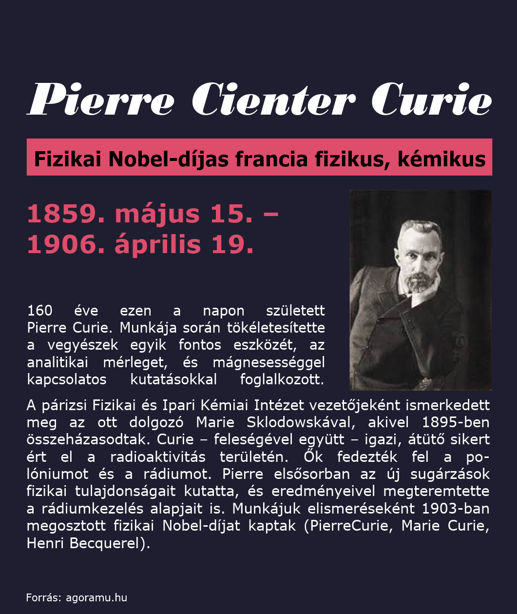 Munkája során tökéletesítette a vegyészek egyik fontos eszközét, az analitikai mérleget, és mágnesességgel kapcsolatos kutatásokkal foglalkozott. A párizsi Fizikai és Ipari Kémiai Intézet vezetőjeként ismerkedett meg az ott dolgozó Marie Sklodowskával, akivel 1895-ben összeházasodtak. Curie – feleségével együtt – igazi, átütő sikert ért el a radioaktivitás területén. Ők fedezték fel a polóniumot és a rádiumot. Pierre elsősorban az új sugárzások fizikai tulajdonságait kutatta, és eredményeivel megteremtette a rádiumkezelés alapjait is. Munkájuk elismeréseként 1903-ban megosztott fizikai Nobel-díjat kaptak (Pierre Curie, Marie Curie, Henri Becquerel).