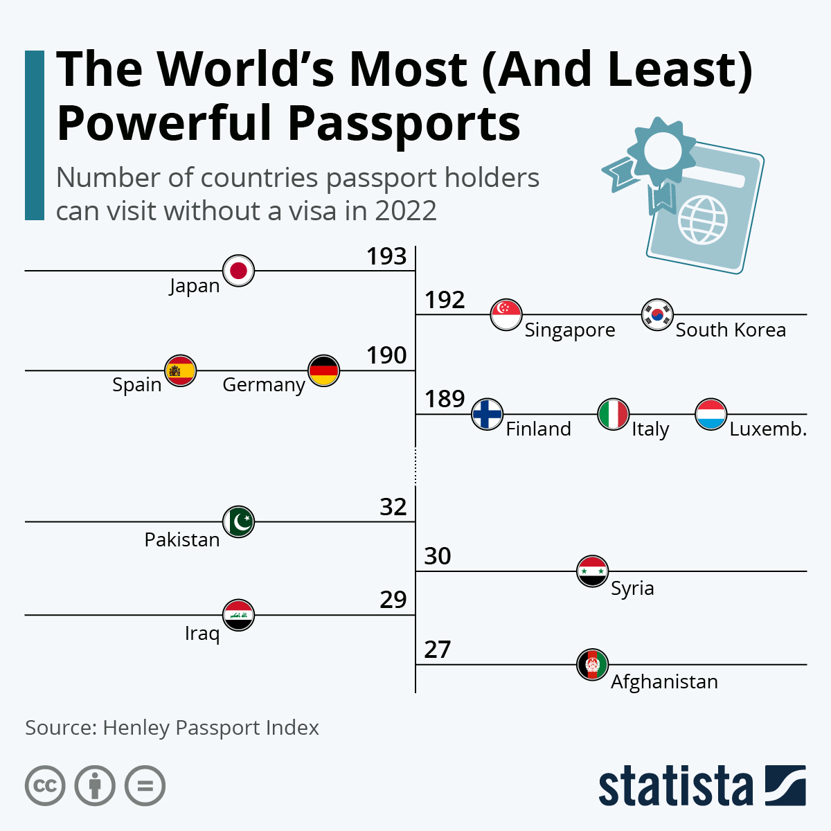 A Henley Passport Index szerint Japán rendelkezik a világ legelfogadottabb útlevelével, állampolgárai 193 országba látogathatnak vízum nélkül. Dél-Korea és Szingapúr közösen a második helyen állnak, lakosai 192 országot kereshetnek fel. Annak ellenére, hogy az Egyesült Államok egy kicsit lejjebb van a listán, a 7. helyen áll, az állampolgárai nagyobb korlátozások nélkül 186 országba léphetnek be. Magyarország a rangsor 9. helyét foglalja el, a magyar útlevéllel rendelkezők 183 országba mehetnek vízummentesen.