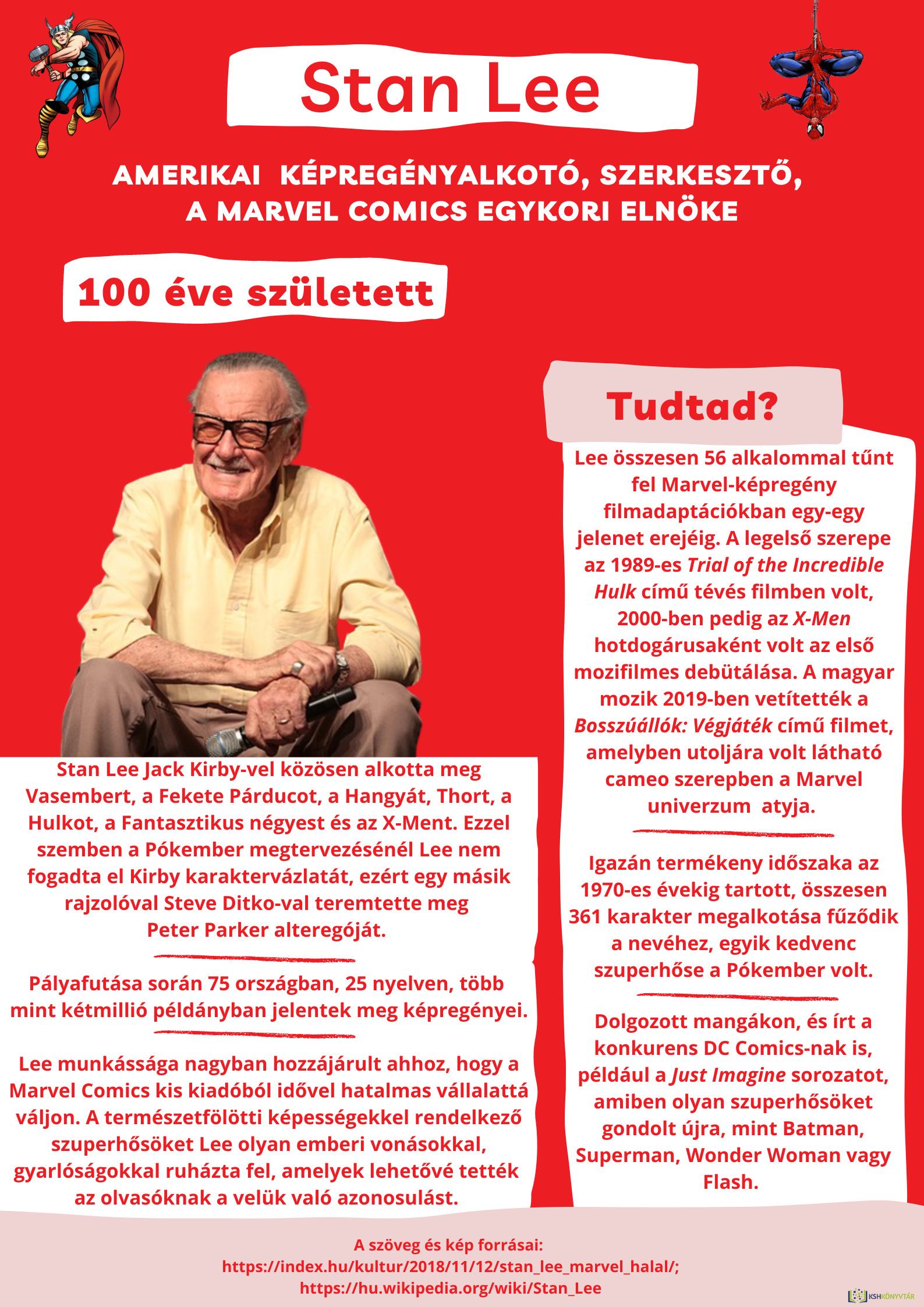 100 éve született Stan Lee (1922–2018) amerikai képregényalkotó, a Marvel Comics egykori elnöke