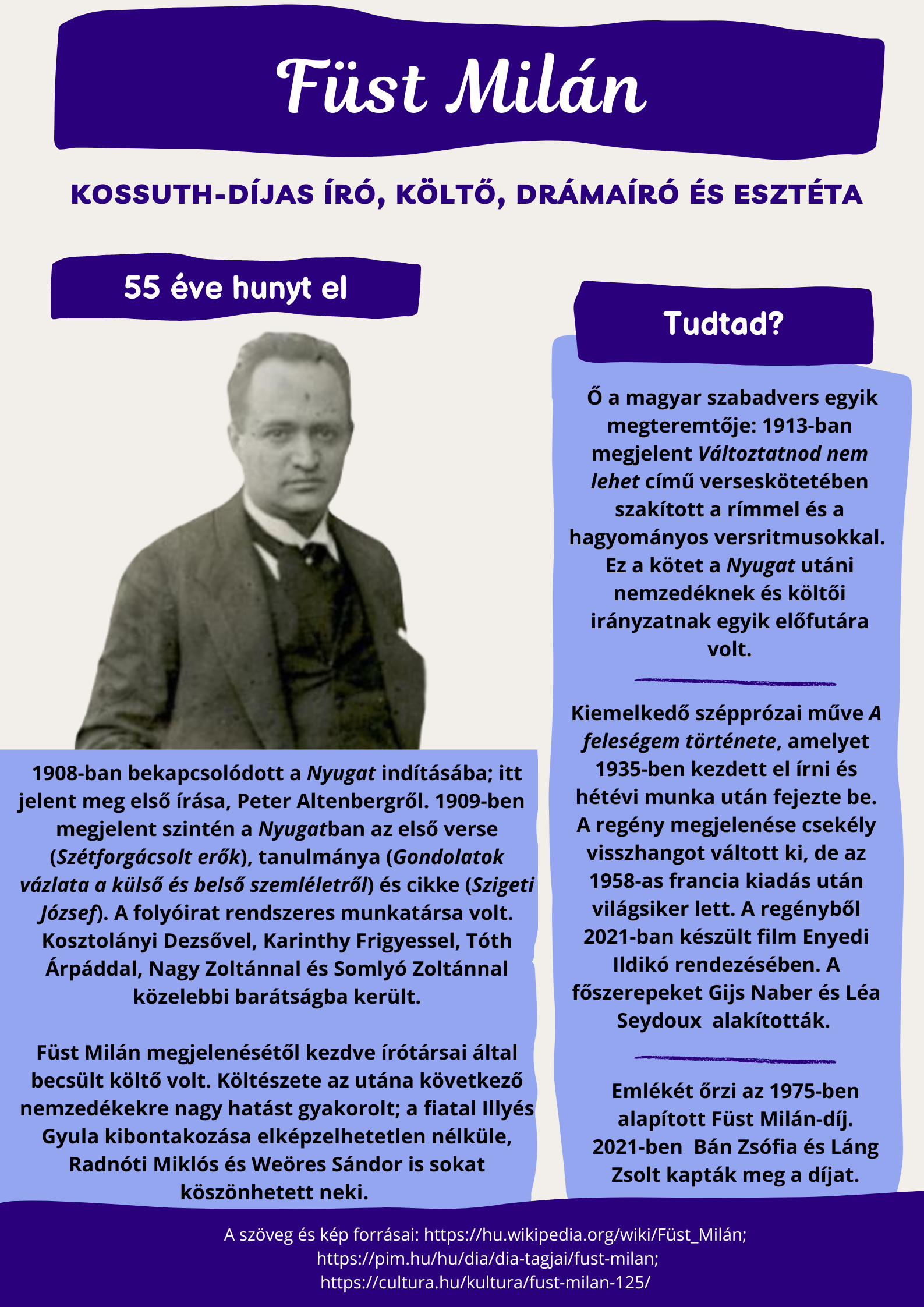 Füst Milán a magyar szabadvers megteremtője. 2000-ben a Digitális Irodalmi Akadémia posztumusz tagjai közé választotta.