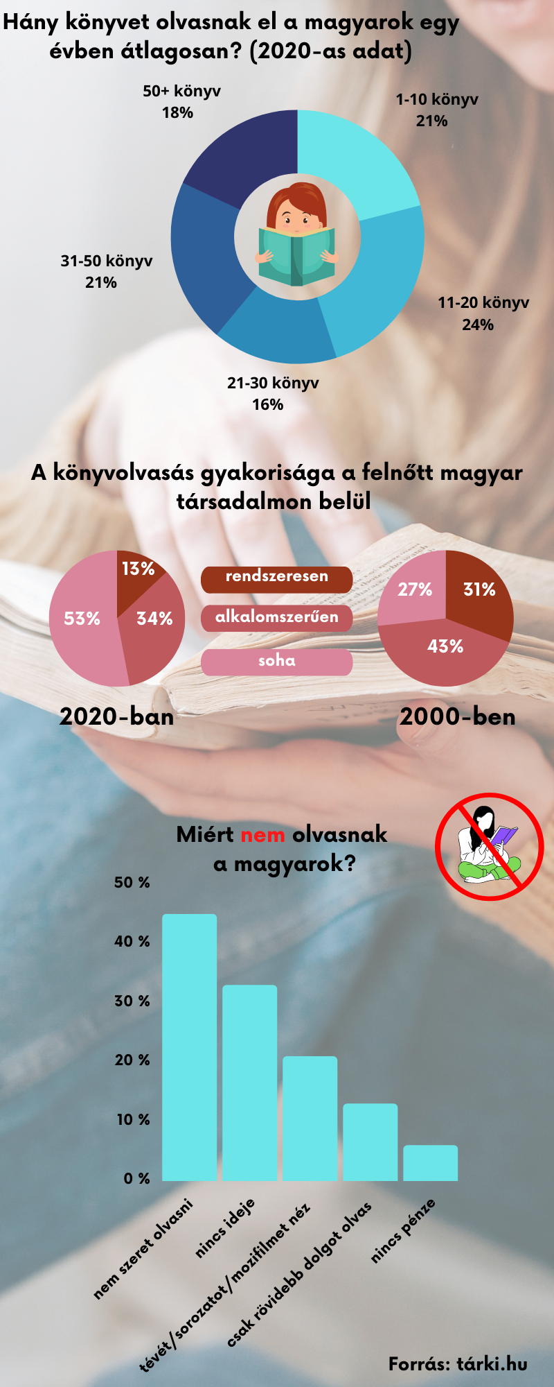 A TÁRKI Társadalomkutatási Intézet Zrt. 2020. június 26. és augusztus 5. között kutatást végzett a rendszeresen olvasó, interneten elérhető felnőtt népesség és a teljes felnőtt magyar lakosság olvasási és könyvvásárlási szokásainak feltérképezésére. A rendszeresen olvasók egy online kérdőívet kitöltve vallottak a könyvolvasási és könyvvásárlási szokásaikról, amelyet 2910 fő töltött ki. A kérdőívre adott válaszok eredményeiből emeltünk ki néhány érdekes adatot, amelyet az alábbi infografikán láthatnak.