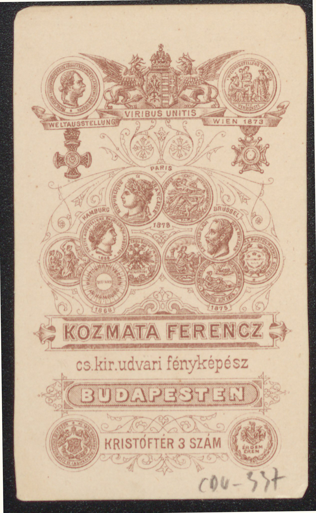 Legújabb szerzeményünk a szegény sorból alig 26 évesen a Fővárosi Statisztikai Hivatal igazgatójává avanzsált Kőrösy Józsefet ábrázolja. A saját kezű aláírással ellátott portré Kozmata Ferenc császári és királyi udvari fényképész Kristóf tér 3. alatti műhelyében készült 1879-ben.