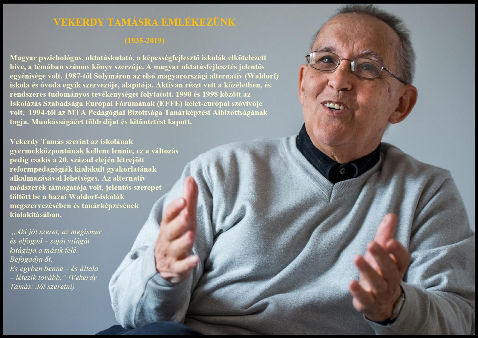 „Aki jól szeret, az megismer és elfogad – saját világát kitágítja a másik felé. Befogadja őt. És egyben benne – és általa – létezik tovább.” (Vekerdy Tamás: Jól szeretni)