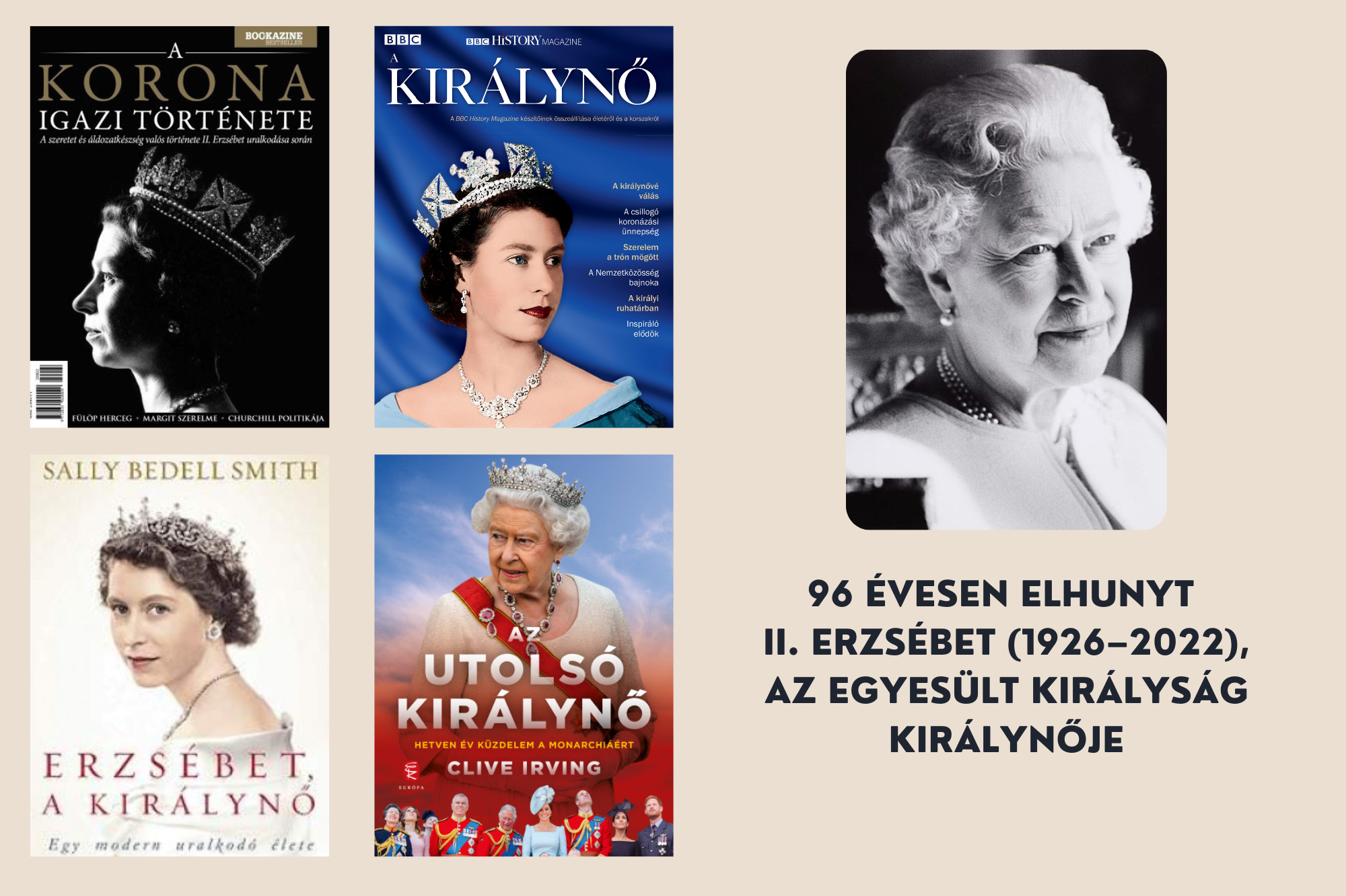 II. Erzsébet 2022. június 13-án a világ második leghosszabb ideig regnáló uralkodója lett 70 év 127 nappal. A királynő az Egyesült Királyság mellett a Nemzetközösség uralkodója is volt egyben. Uralkodása alatt 15 miniszterelnök váltotta egymást, Sir Winston Churchilltől Liz Trussig. Férjétől, Fülöp edinburgh-i hercegtől 4 gyermeke született, akik közül a legidősebb fia, Károly fogja követni a trónon, III. Károly néven. Életéről és uralkodásáról számtalan könyv, film és sorozat is készült. Néhány könyvet ajánlunk azoknak, akik szeretnének megismerkedni a néhai királynő életével.