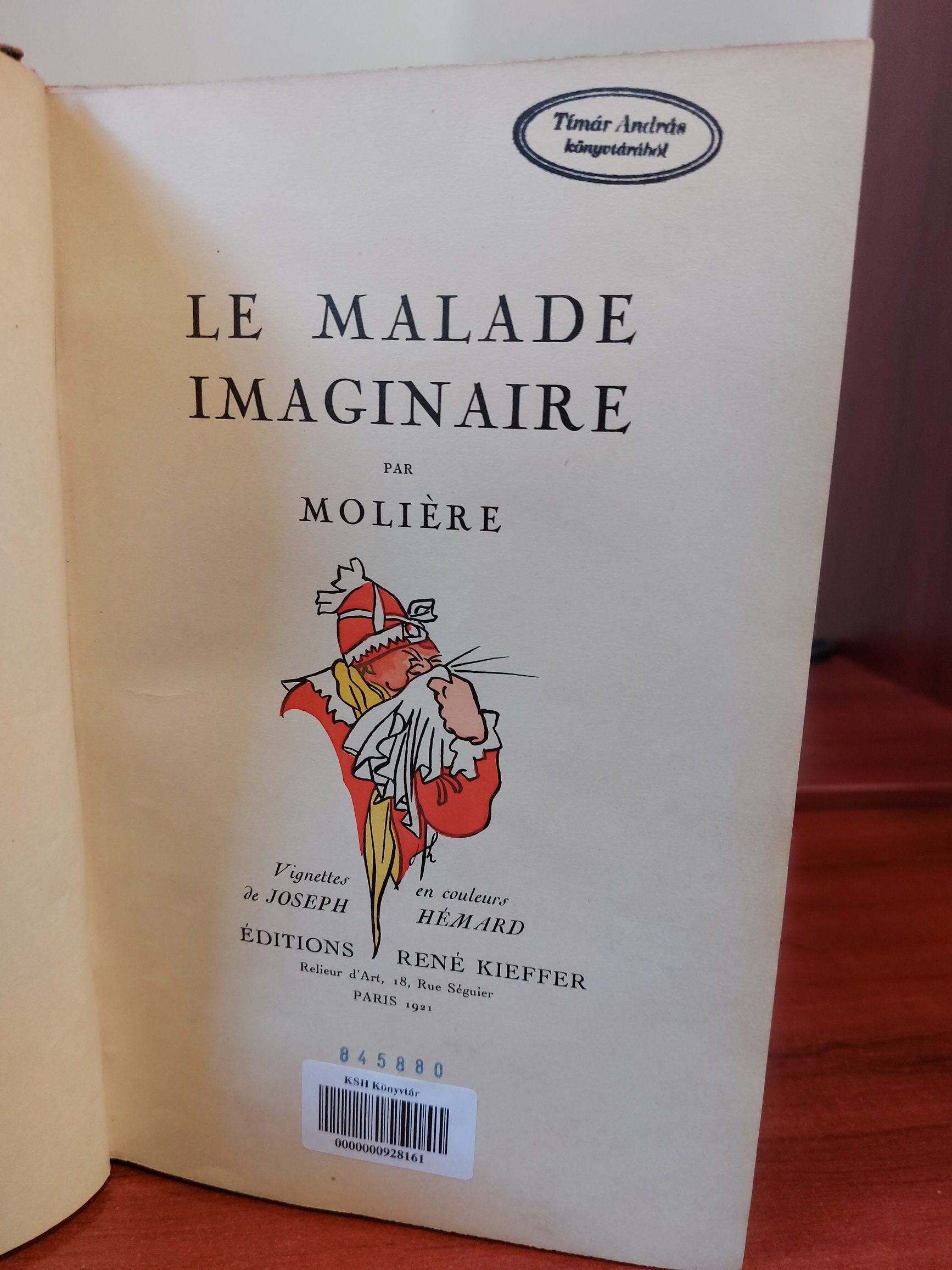 Az 1921-ben Párizsban kiadott francia nyelvűt, A képzelt beteg példányát (rakt. jelz.: 845880), Joseph Hémárd illusztrációi gazdagítják, valamint dombornyomott bőrkötéssel látták el.