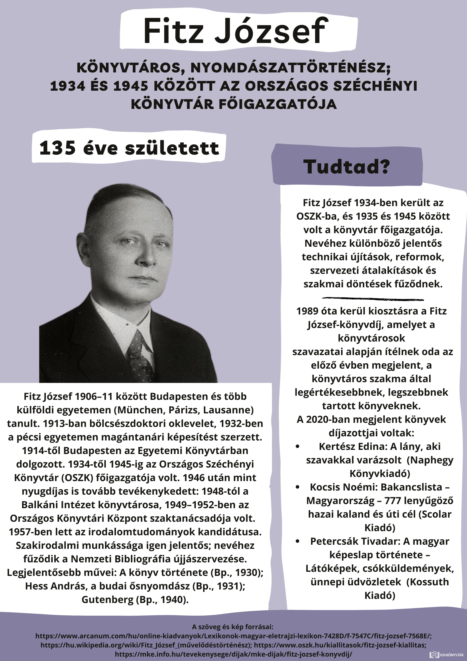 135 éve született Fitz József (1888-1964) magyar könyvtáros; 1934 és 1945 között az Országos Széchényi Könyvtár főigazgatója