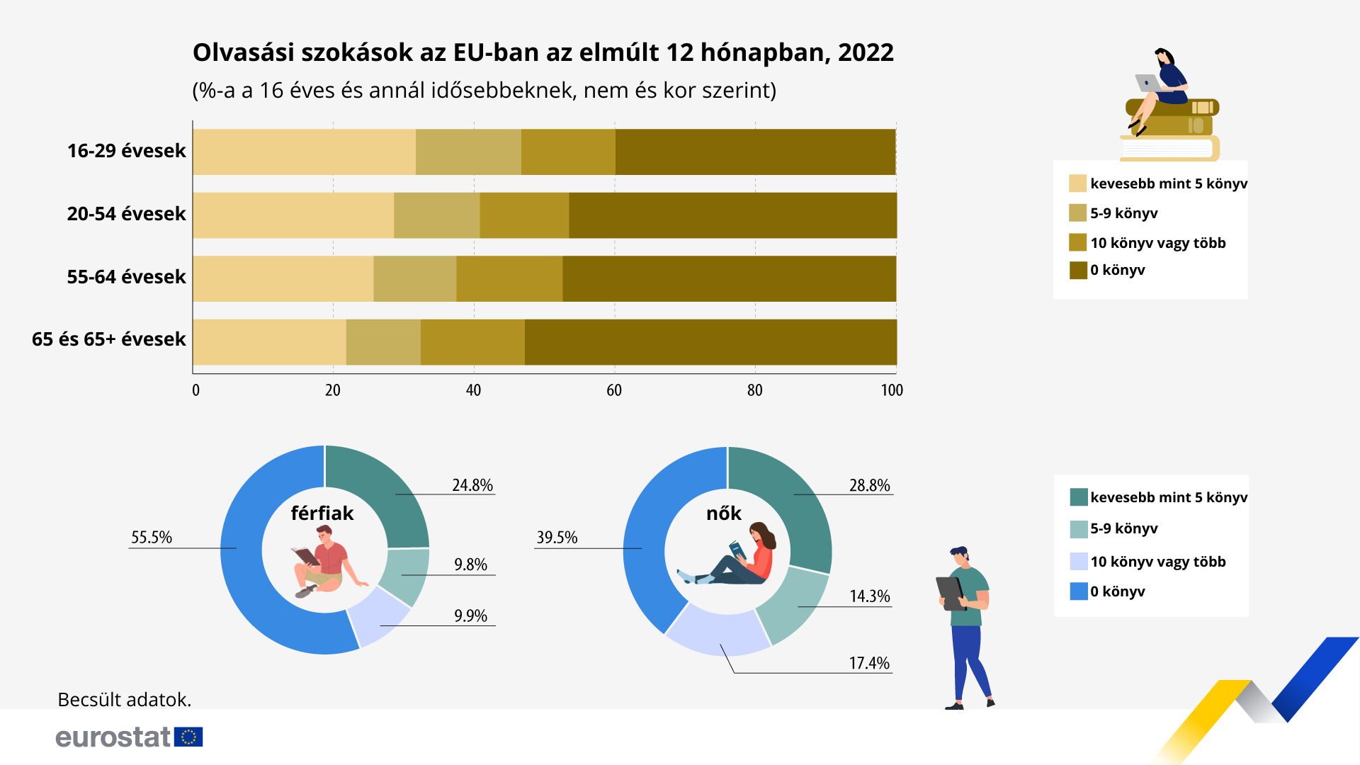 A világnap kapcsán hoztunk egy 2022-es EuroStat által elvégzett olvasási szokásokat vizsgáló kutatást, amelyben a 16 éves vagy annál idősebb európai uniós lakosság 52,8%-a számolt be arról, hogy az elmúlt 12 hónapban olvasott-e könyveket. Az infografikán látható, hogy a legfiatalabb, a 16-29 éves korcsoport többet olvas (60,1%), mint a 30 és 54 év közöttiek (53,5%), az 55 és 64 év közöttiek (52,6%), valamint a 65 évesek és az ennél idősebbek (47,2%). A felmérés azt is kimutatta, hogy az EU-ban több nő olvas könyvet (60,5%), mint férfi (44,5%). Ugyanez a minta volt megfigyelhető az olvasott könyvek számát tekintve is (lásd az infografikát). Az uniós országok közül Luxemburgban a legmagasabb azoknak az aránya, akik olvastak könyvet a vizsgálatot megelőző 12 hónapban (75,2%), ezt követi Dánia (72,1%) és Észtország (70,7%). Ezzel szemben Romániában csak az emberek 29,5%-a olvasott könyvet, Cipruson 33,1%, Olaszországban pedig 35,4%.