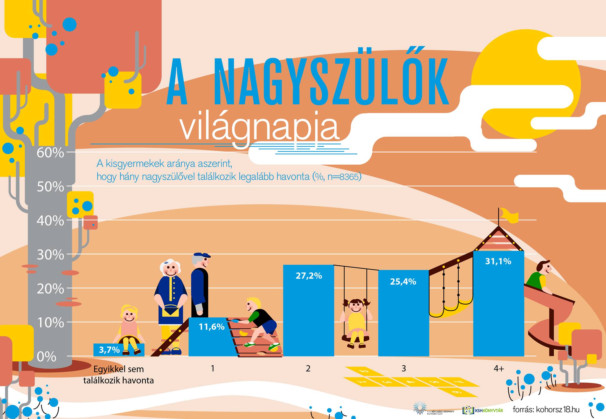 A KSH Népességtudományi Kutatóintézet által végzett Kohorsz '18 kutatás felmérése a nagyszülők jelenlétét is vizsgálta. A kutatás második szakaszában arra voltak kíváncsiak a szakemberek, hogy a gyermekek milyen gyakran találkoznak a nagyikkal. Jó hír, hogy összességében az unokák 95%-a legalább egy nagyszülőjével gyakran találkozik, 31%-uk pedig mind a négy nagyszülőjét legalább havonta látja.