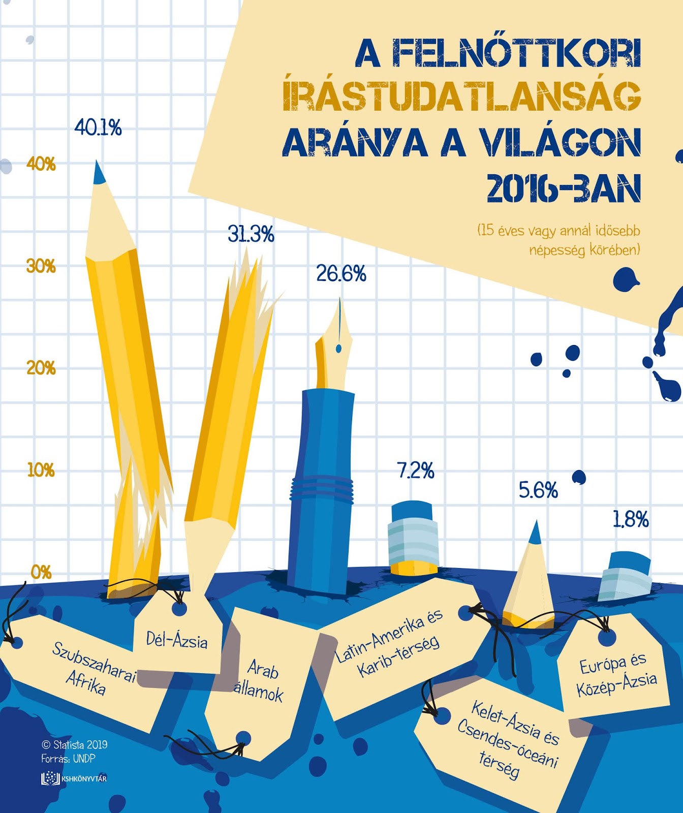 Az írástudatlanság ellen mi, könyvtárak is sokat tehetünk, például az olvasás népszerűsítésével. Az analfabetizmus az írástudás hiányát jelenti, vagyis azt, hogy egy felnőtt nagyon rosszul, vagy egyáltalán nem tud írni-olvasni. Infografikánkkal arra szeretnék a figyelmet felhívni, hogy vannak olyan régiók a világon, ahol sok-sok íróeszközre lenne szükség ahhoz, hogy a helyzet javuljon.