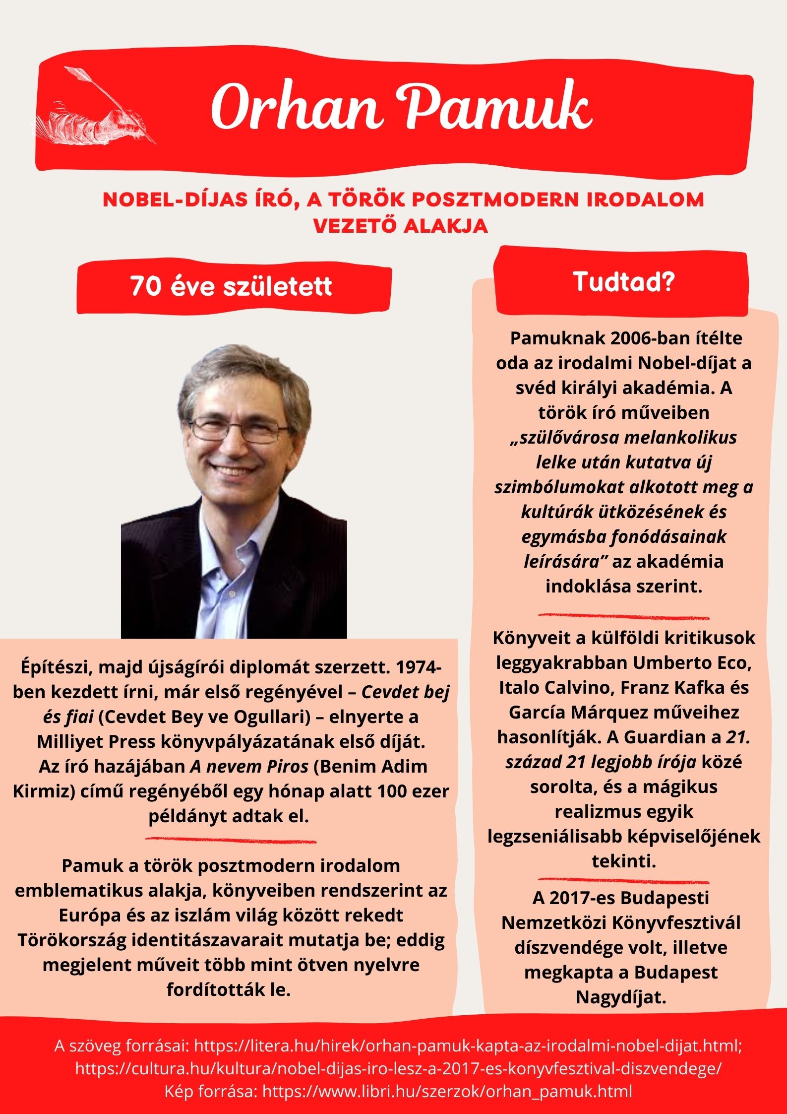 Ma, 70 éves Orhan Pamuk Nobel-díjas író, a török posztmodern irodalom vezető alakja