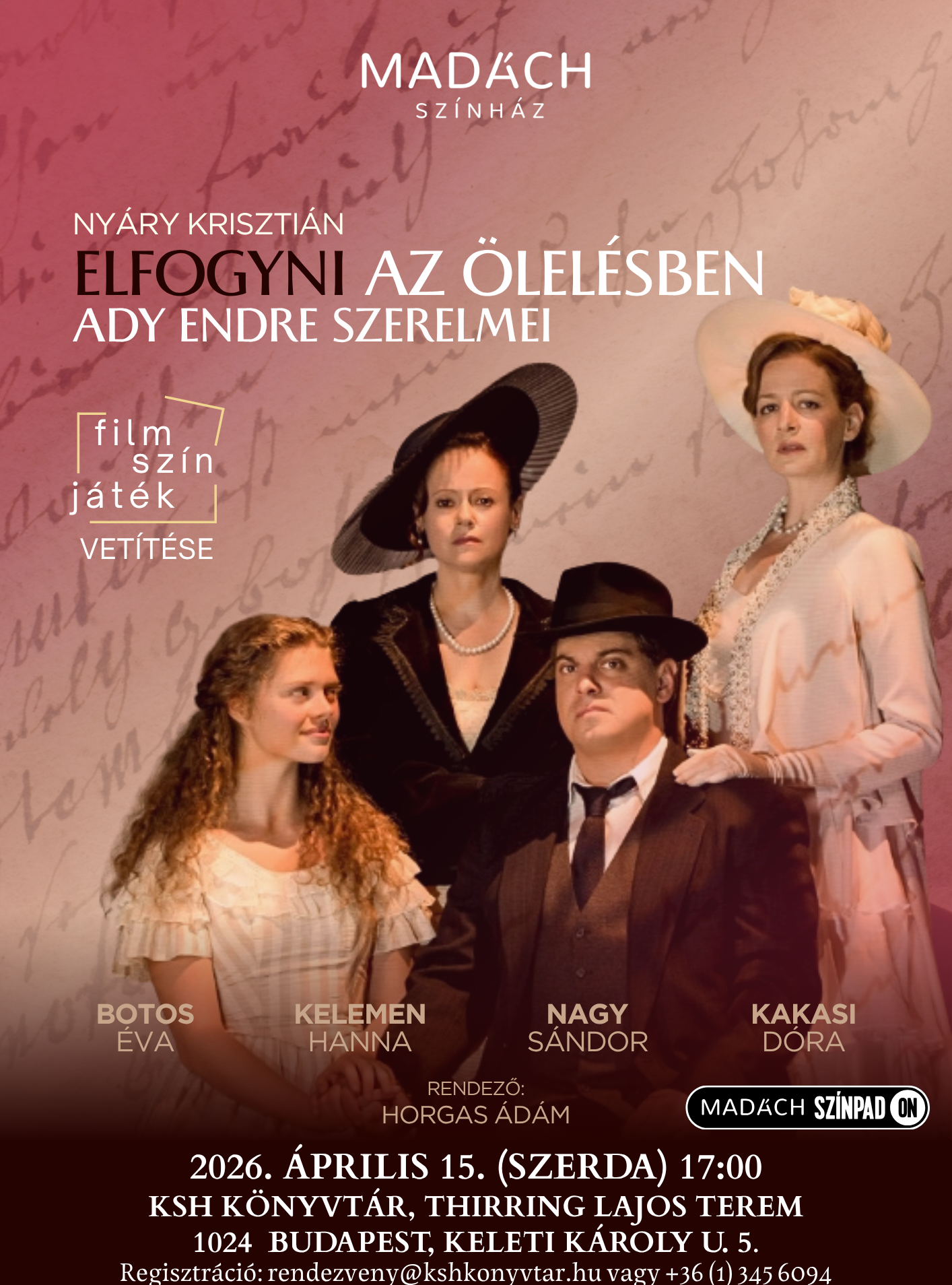 Szeretettel hívunk minden színház iránt érdeklődőt a Madách Színház Írók–Sorsok–Szerelmek című online tematikus filmsorozatának film‑szín‑játékára, amelyben Ady Endre önpusztító életmódjának és szerelmi négyszögének története elevenedik meg.