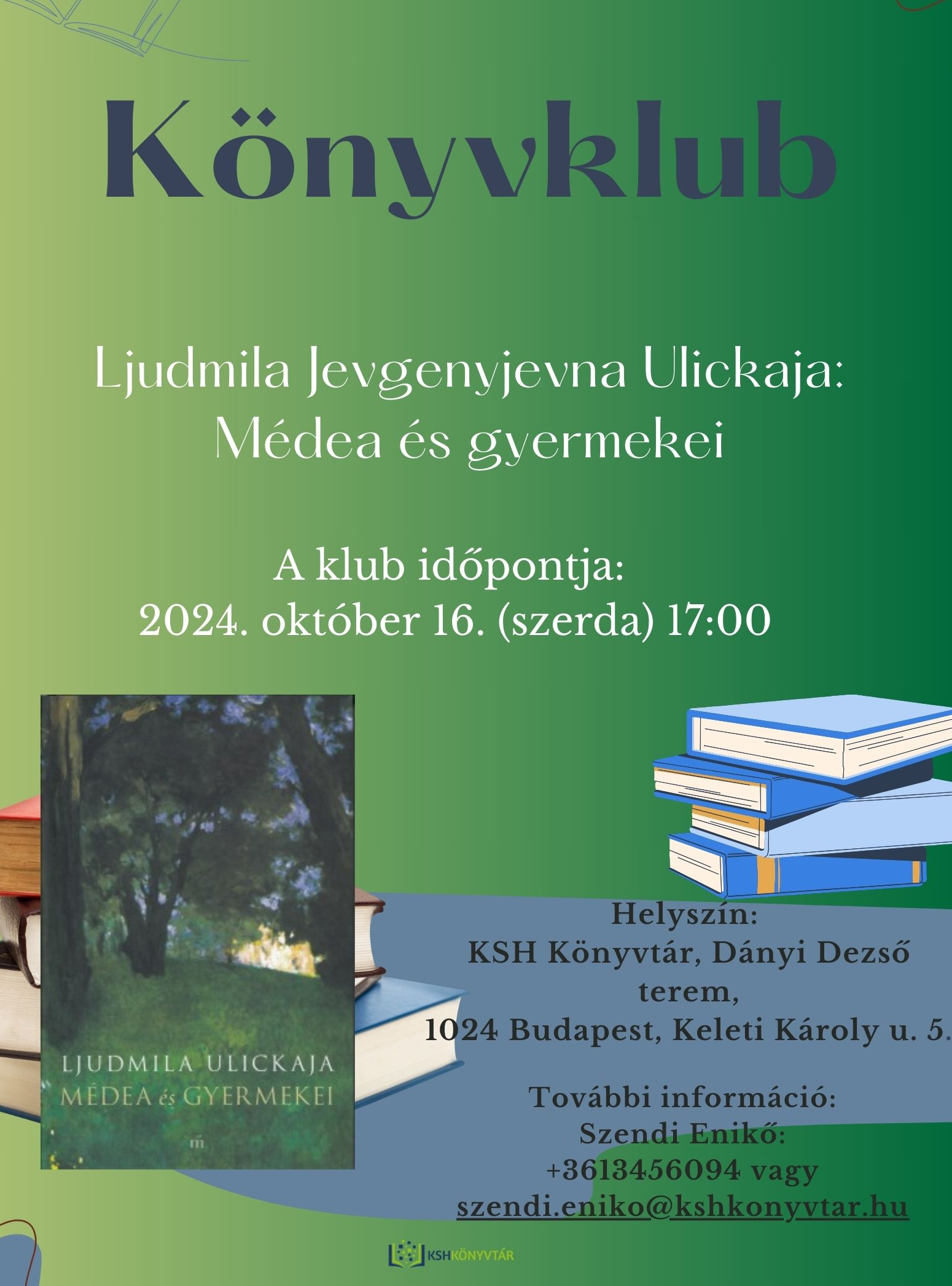 2024. október 16. (szerda) 17 órától sok szeretettel vár minden érdeklődőt a KSH Könyvtár könyvklubja, ahol ezúttal a Ljudmila Jevgenyjevna Ulickaja: Médea és gyermekei a téma!