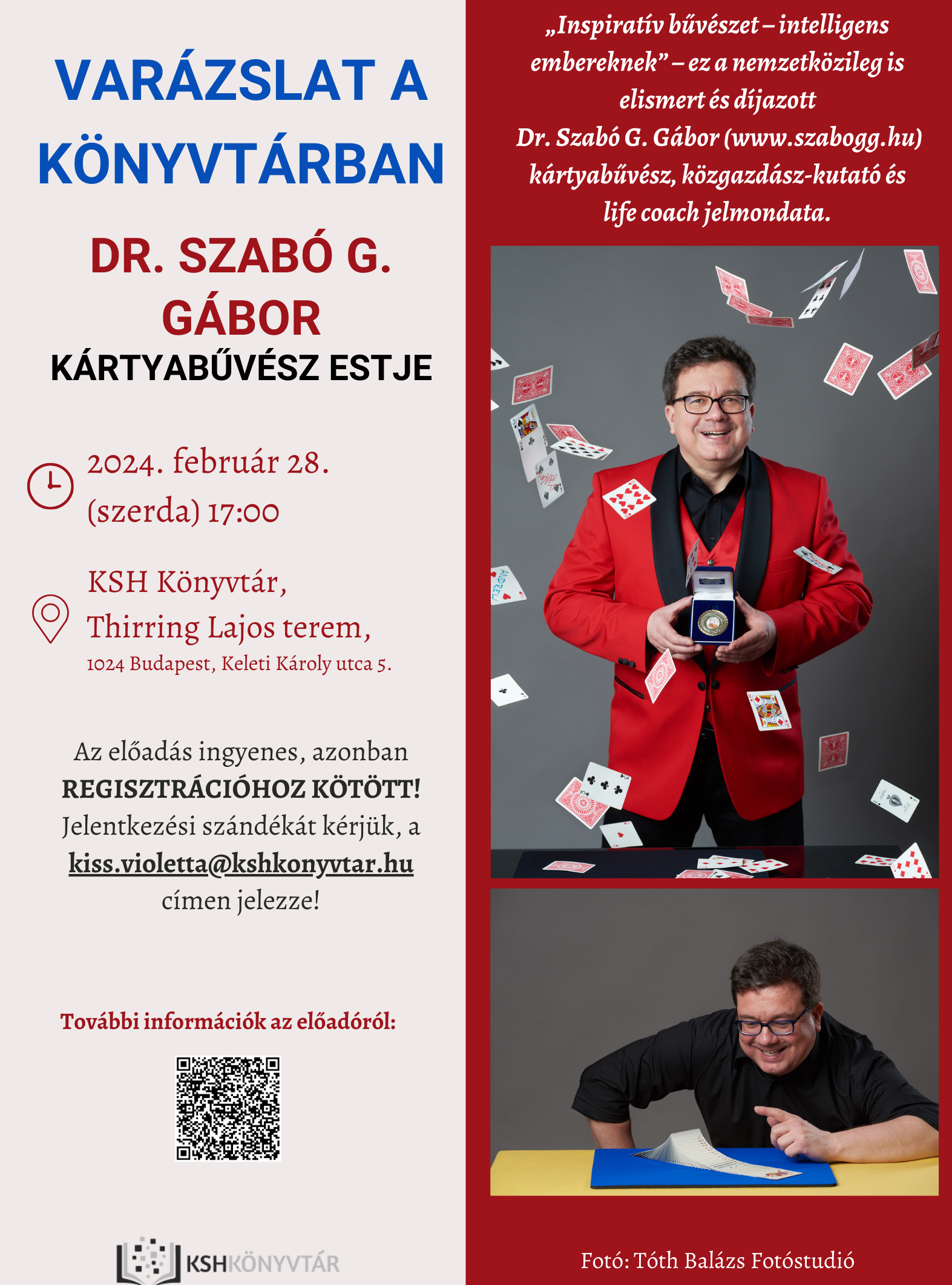 „Inspiratív bűvészet – intelligens embereknek” – ez a nemzetközileg is elismert és díjazott Dr. Szabó G. Gábor (www.szabogg.hu) kártyabűvész, közgazdász-kutató és life coach jelmondata, akinek estjére szeretettel várjuk az érdeklődőket!