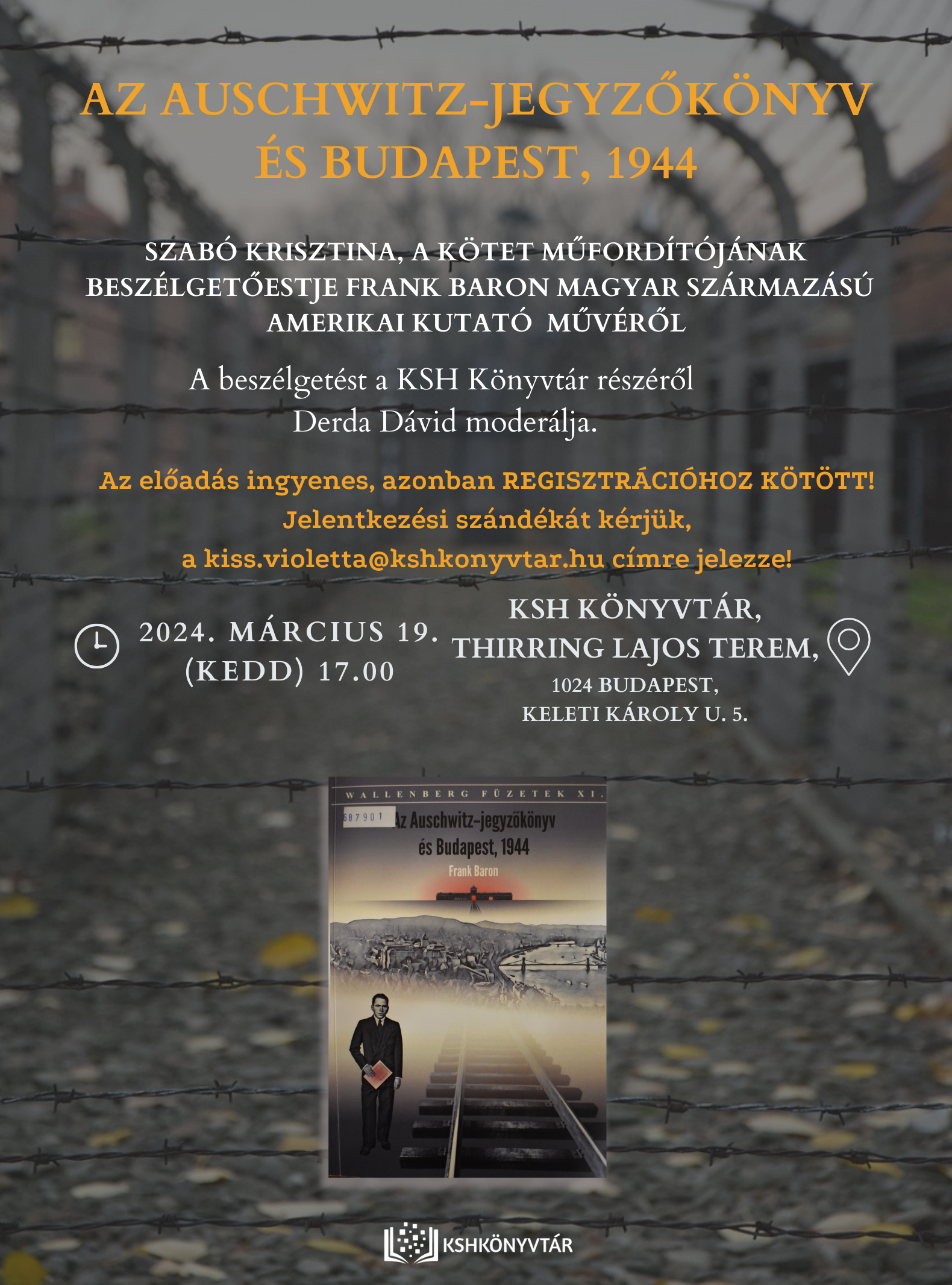 Szeretettel várjuk az érdeklődőket Szabó Krisztina, Az Auschwitz-jegyzőkönyv és Budapest, 1944 című kötet műfordítójának beszélgetőestjére, amelynek során Frank Baron magyar származású amerikai kutató művéről beszélgetnek majd Derda Dáviddal, a KSH Könyvtár kézirattárosával.