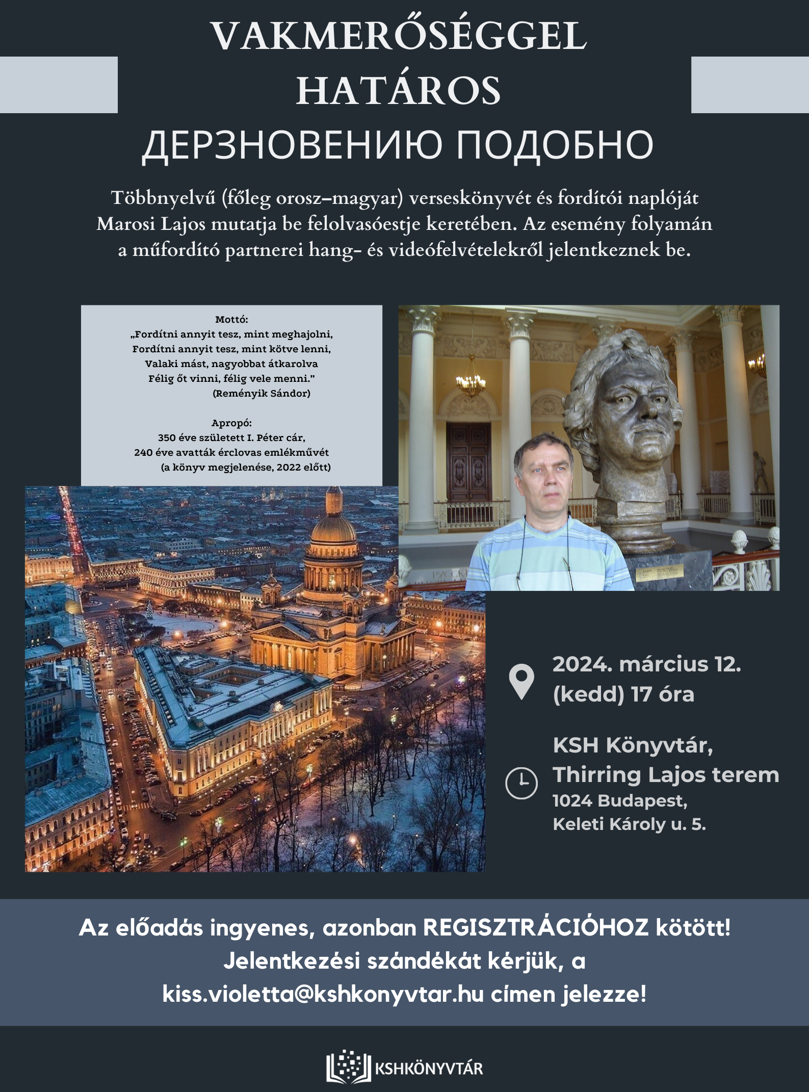 Többnyelvű (főleg orosz–magyar) verseskönyvét és fordítói naplóját Marosi Lajos mutatja be felolvasóestje keretében.