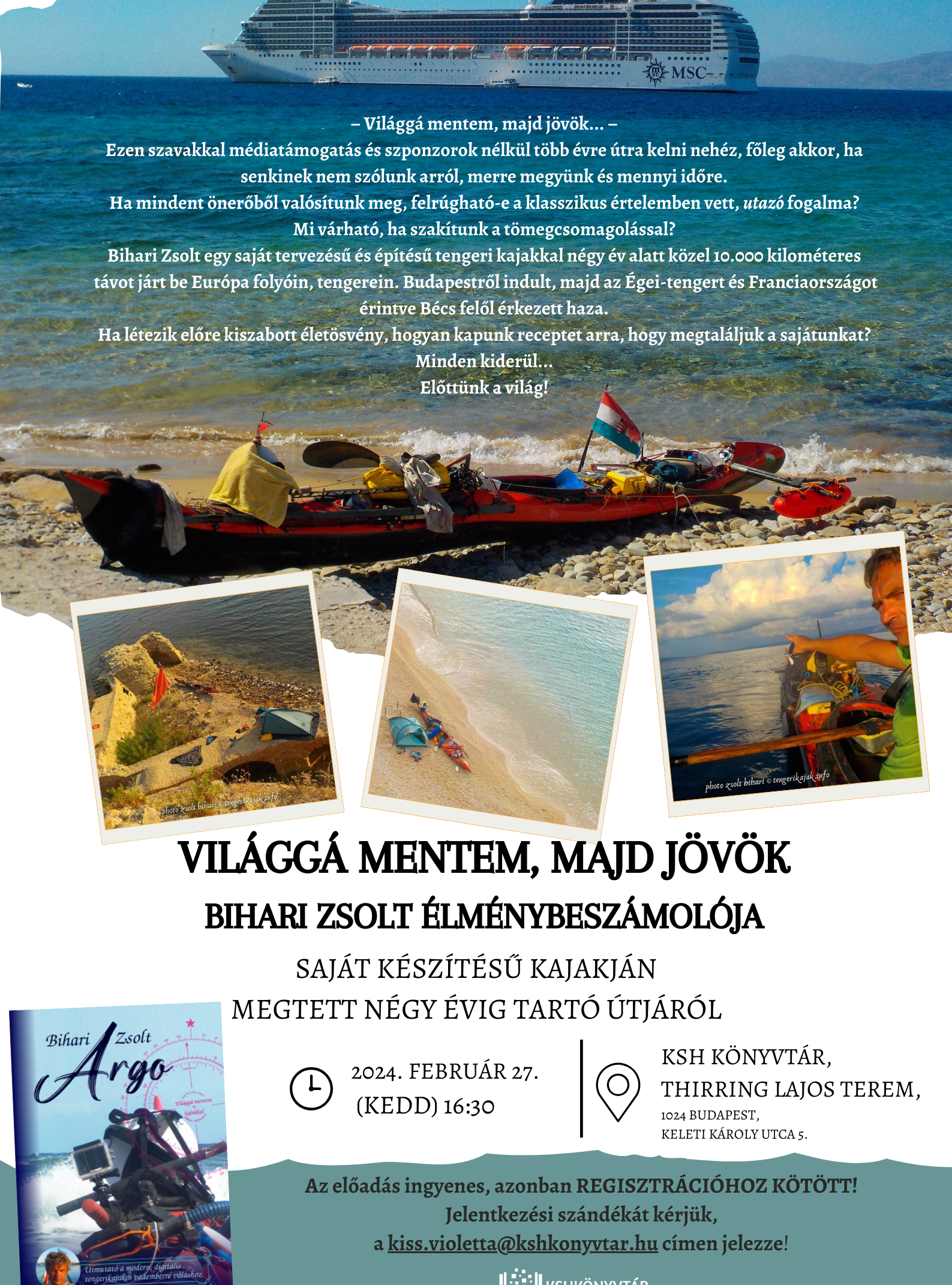 "Világgá mentem, majd jövök... – ezen szavakkal médiatámogatás és szponzorok nélkül" indult négy évig tartó útjára Bihari Zsolt saját készítésű tengeri kajakján Európa folyóin és tengerein. Várjuk sok szeretettel mindazokat, akik kíváncsiak az Argo I. című kötet szerzőjének izgalmas és kalandos élménybeszámolójára.