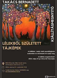 2024. március 21-én (csütörtök) 17:30-tól sok szeretettel várjuk az érdeklődőket Takács Bernadett festőművész Lélekből született tájképek című kiállításának megnyitóján.
