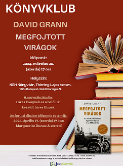 2024. március 20-án (szerda) 17 órától sok szeretettel vár minden érdeklődőt a KSH Könyvtár könyvklubja! Az est során David Grann Megfojtott virágok című művét dolgozzák fel.