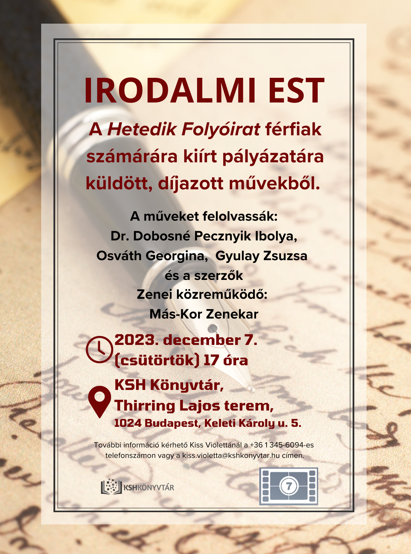 2023. december 7-én (csütörtök) 17 órától egy irodalmi estre invitálunk mindenkit, melynek keretében az A Hetedik Folyóirat férfiak számárára kiírt pályázatára küldött, díjazott művekből hangzanak el alkotások.
