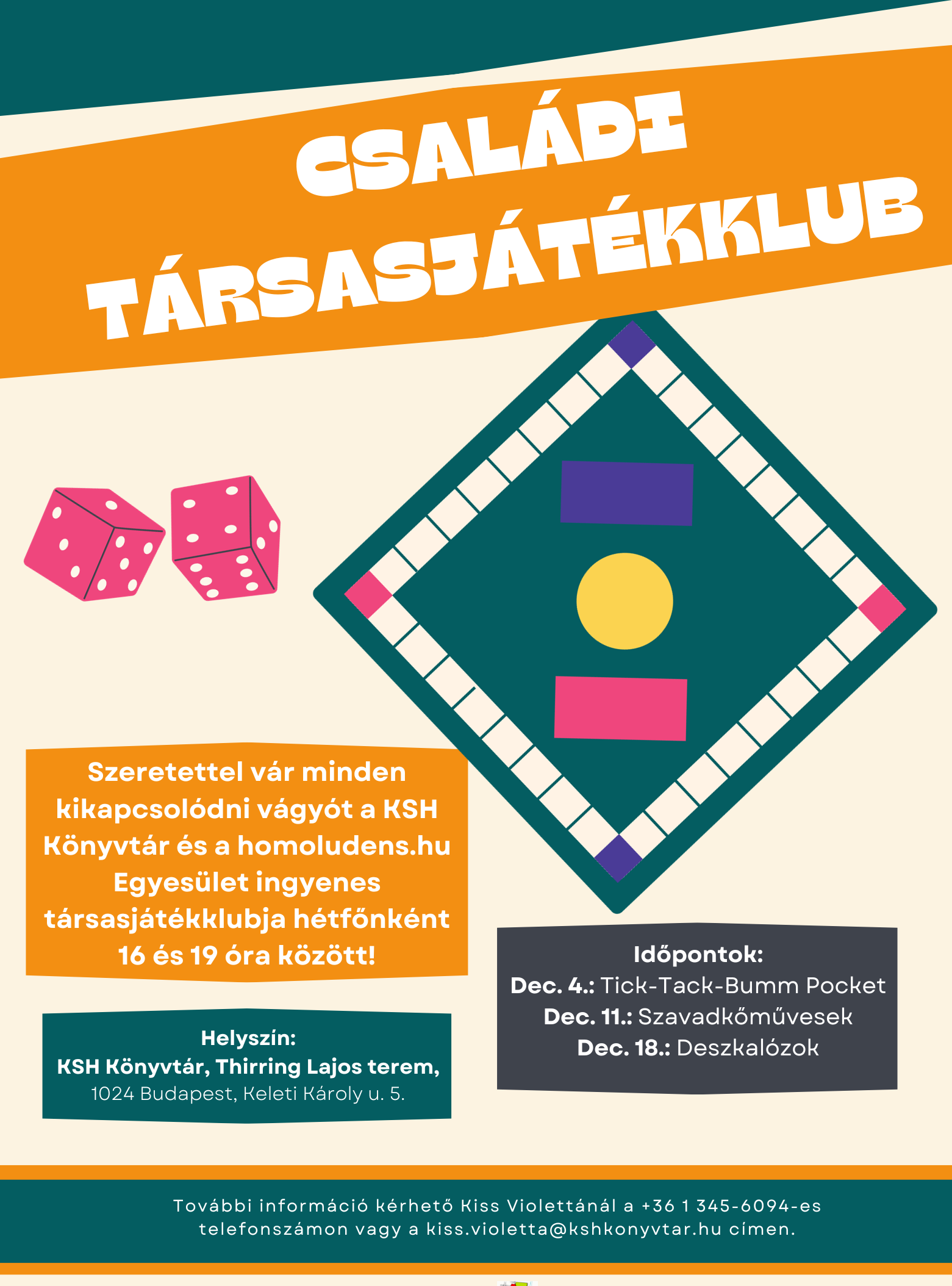 Szeretettel várja az érdeklődő kicsiket és nagyokat a KSH Könyvtár és a homoludens.hu Egyesület közös rendezésű családi társasjátékklubja hétfőnként 16 és 19 óra között.