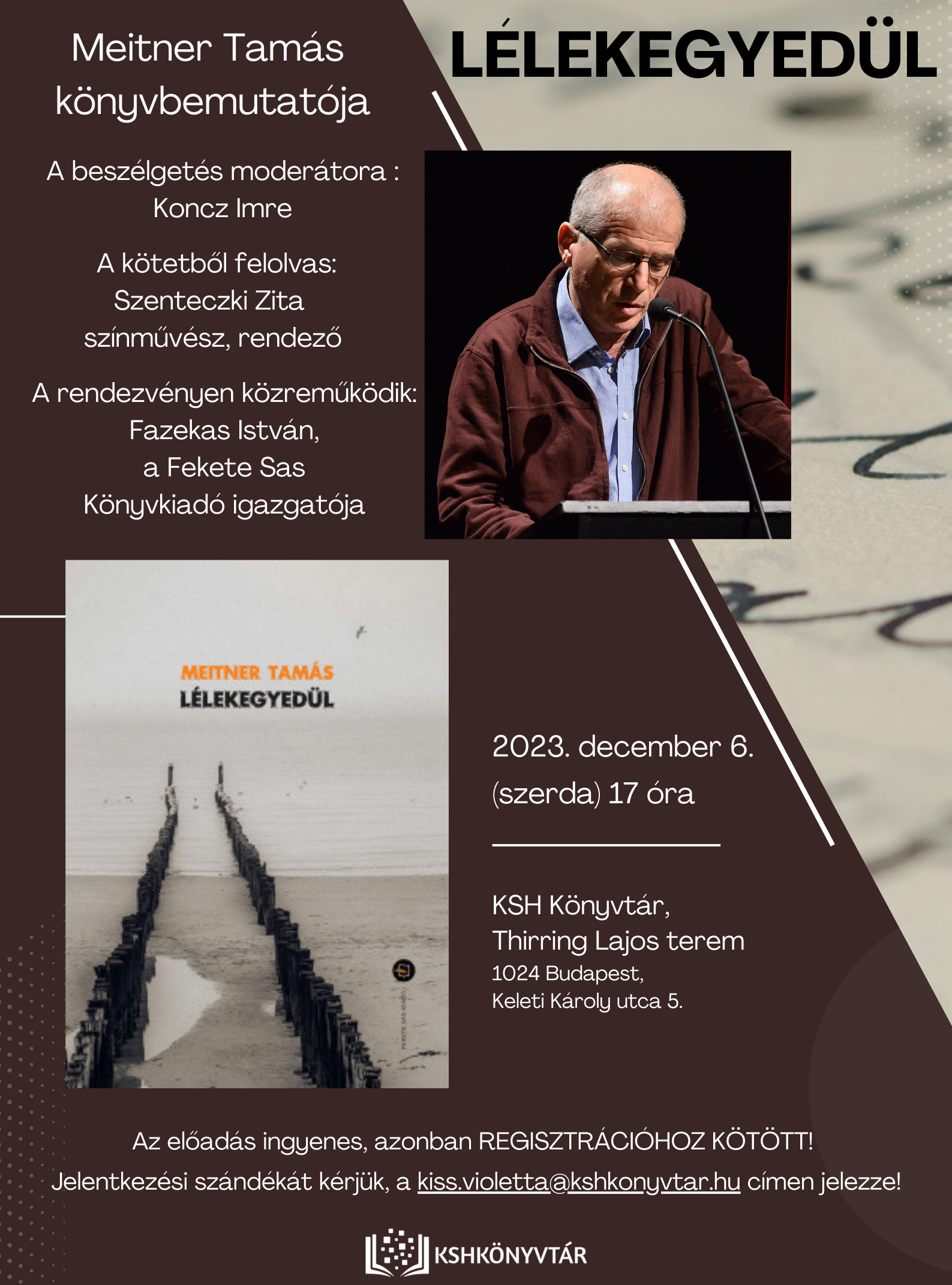 Szeretettel várjuk az érdeklődőket Meitner Tamás Lélekegyedül című regényének könyvbemutatóján, ahol a szerző Koncz Imrével fog beszélgetni a kötetről.