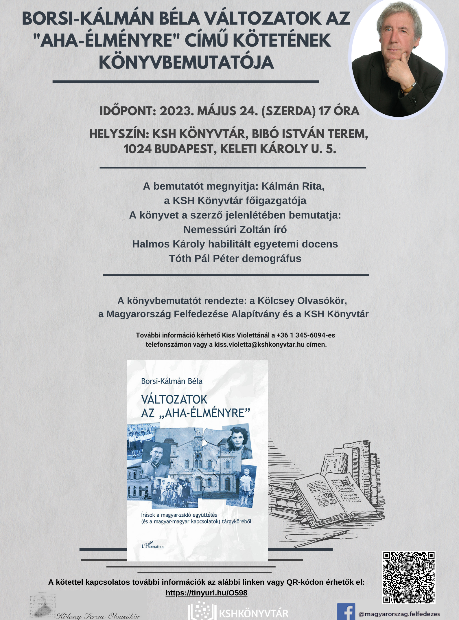 2023. május 24-én (szerda) 17 órától várjuk az érdeklődőket Borsi-Kálmán Béla Változatok az "aha-élményre" - Írások a magyar-zsidó együttélés (és a magyar-magyar kapcsolatok) tárgyköréből című kötet könyvbemutatójára a Kölcsey Ferenc Olvasókör, a Magyarország Felfedezése Alapítvány és a KSH Könyvtár szervezésében!