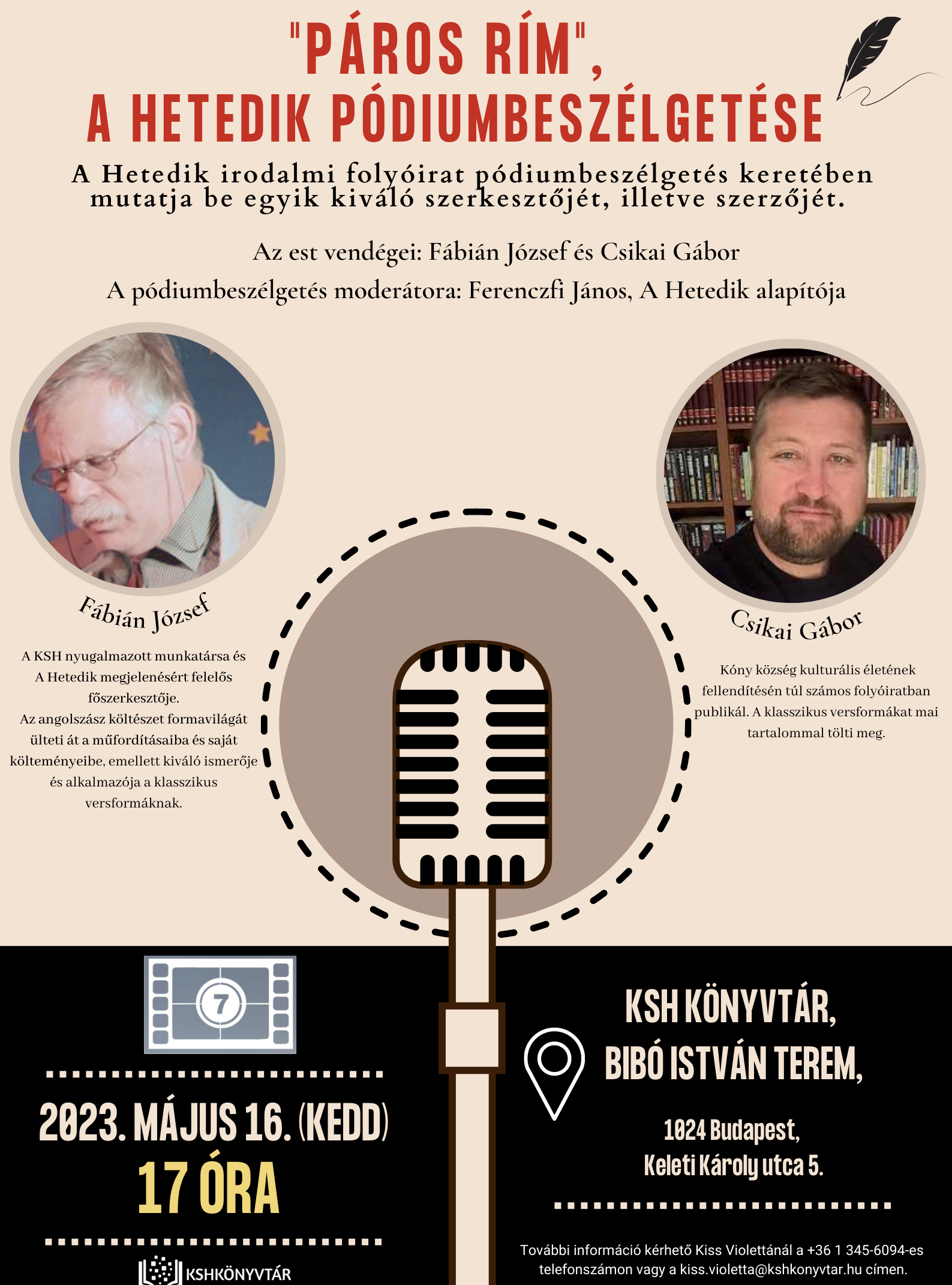 2023. május 16-án (kedd) 17 órakor A Hetedik irodalmi folyóirat Páros Rím címmel várja szeretettel az érdeklődőket egy pódiumbeszélgetésre! Az est során Fábián Józseffel és Csikai Gáborral, a Hetedik egy szerkesztőjével és egy szerzőjével Ferenczfi János, A Hetedik alapítója beszélget majd. Az elhangzó műveiken és a kérdésekre adott válaszaikon át jobban megismerhetjük őket és munkásságukat.