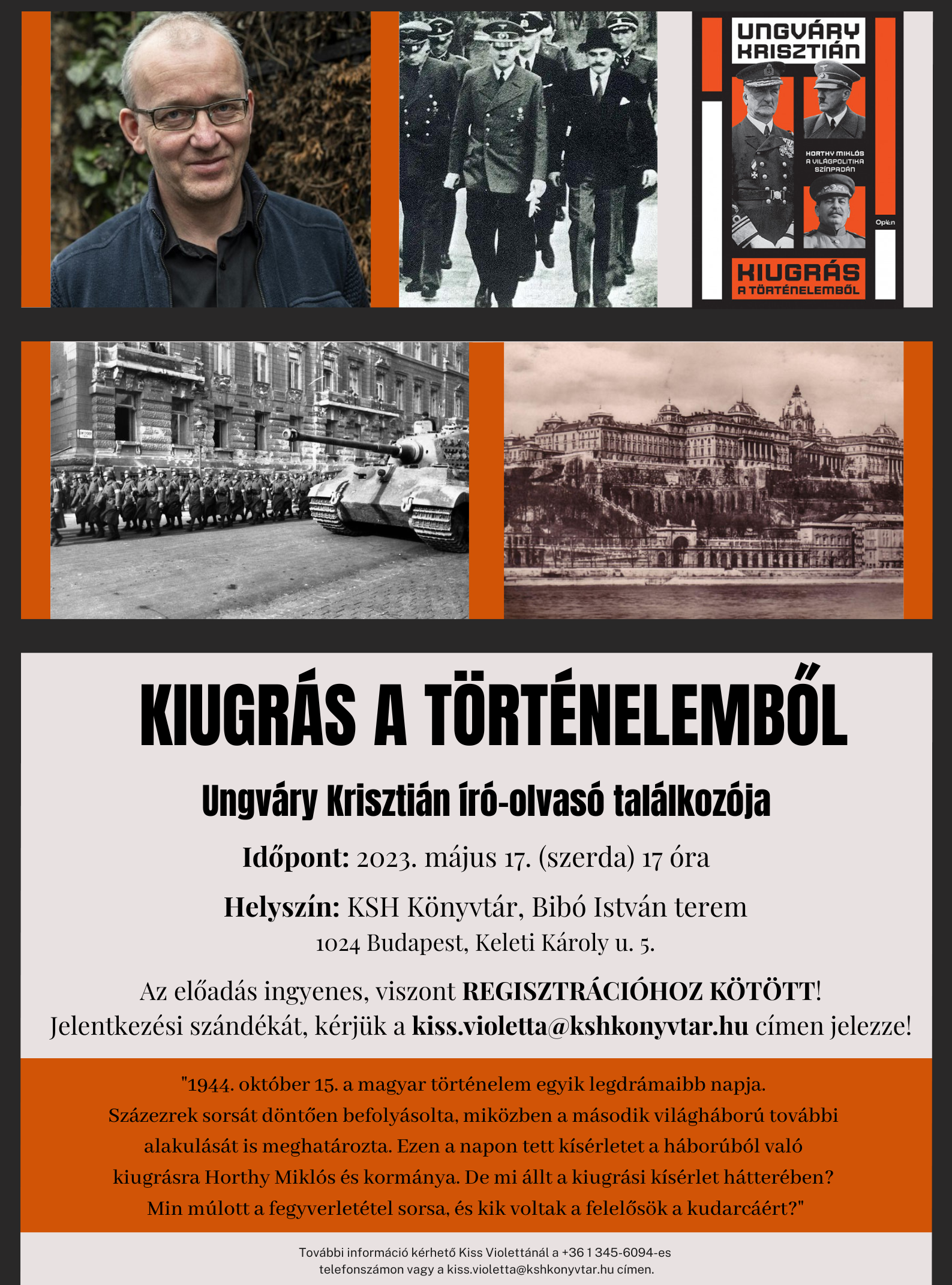2023. május 17-én (szerda) 17 órától sok szeretettel várunk minden érdeklődőt Ungváry Krisztián magyar történész Kiugrás a történelemből című történelmi kötetének könyvbemutatójára egy író-olvasó találkozó keretében!