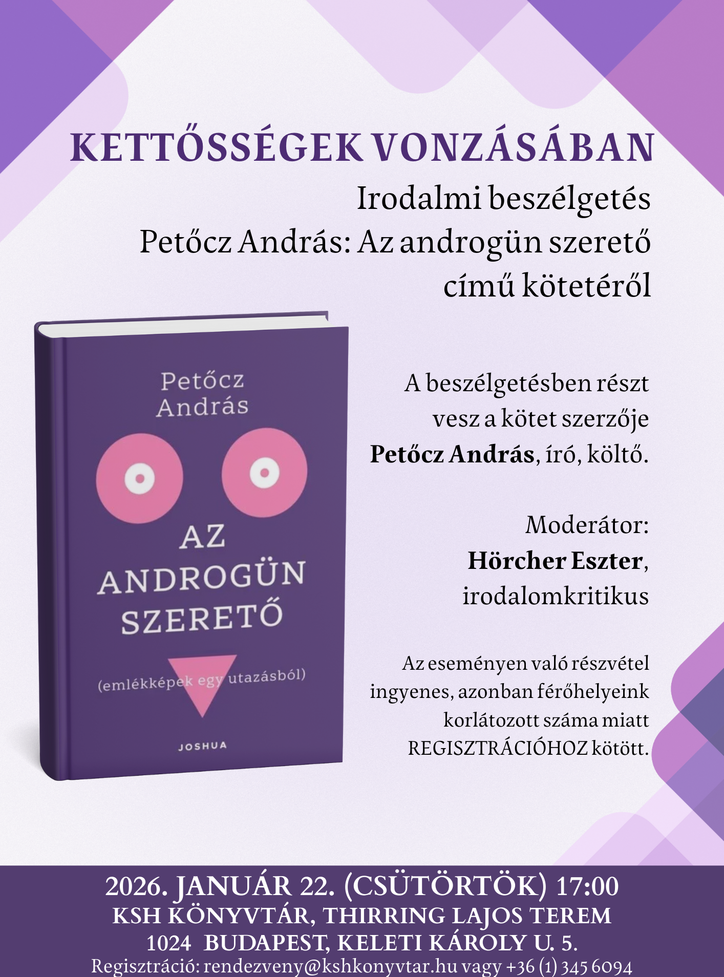 A KSH Könyvtár szeretettel várja az érdeklődőket egy irodalmi beszélgetésre Petőcz András: Az androgün szerető című kötetéről, amely január 22-én 17 órakor kerül megrendezésre.
