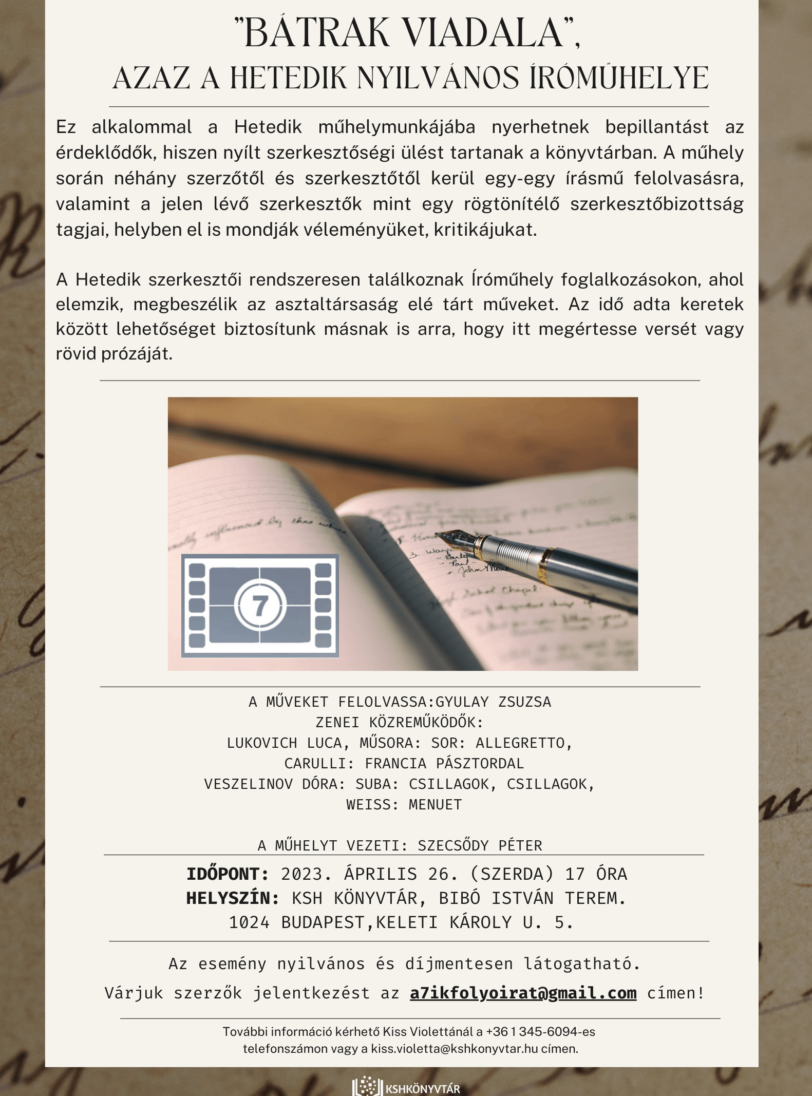 AHetedik című irodalmi folyóirat műhelymunkájába nyerhetünk bepillantást 2023. április 26-án (szerda) 17 órakor egy nyilvános íróműhely keretében, mely a „Bátrak viadala” címmel kerül megrendezésre.