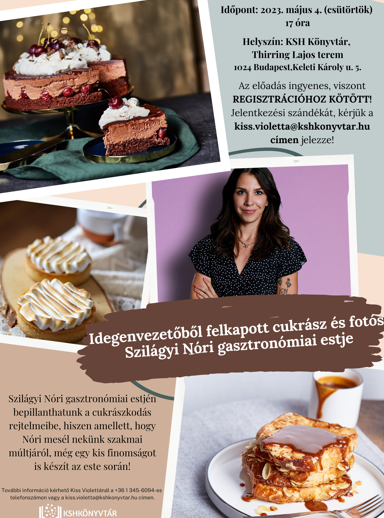 2023. május 4-én (csütörtök) 17 órakor sok szeretettel várunk minden érdeklődőt Szilágyi Nóri cukrász és fotós gasztronómiai estjére!