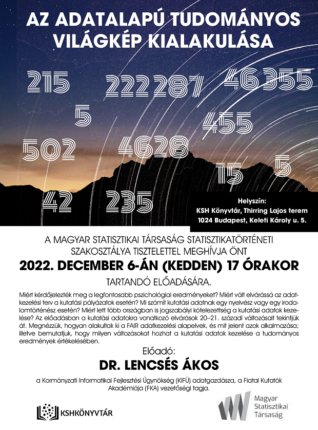 2022. december 6-án 17 órai kezdettel a Magyar Statisztikai Társaság Statisztikatörténeti Szakosztályának rendezvényén dr. Lencsés Ákos, a Kormányzati Informatikai Fejlesztési Ügynökség (KIFÜ) adatgazdásza, a Fiatal Kutatók Akadémiája (FKA) vezetőségi tagja tart előadást Az adatalapú tudományos világkép kialakulása címmel.