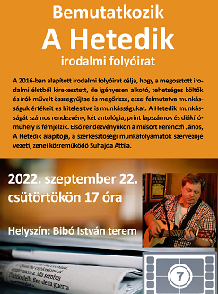 2022. szeptember 22-én (csütörtökön) 17:00 órától várjuk a kedves érdeklődőket A Hetedik című folyóirat műsorára.