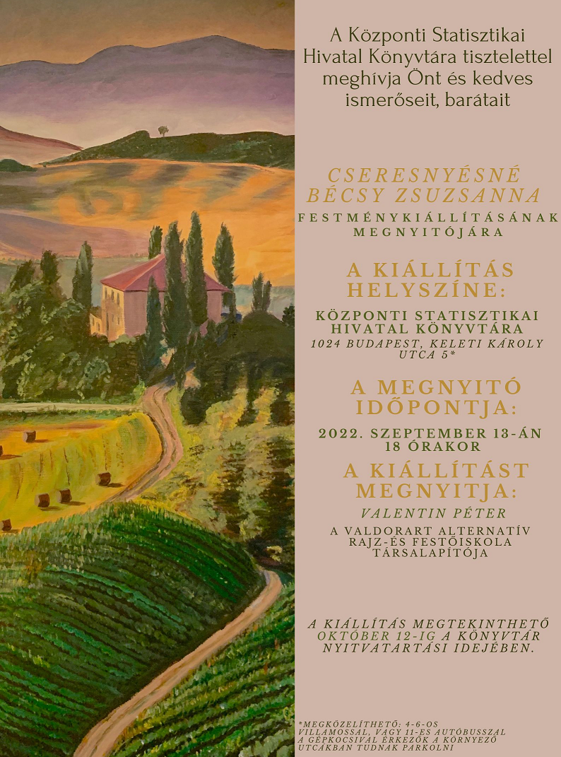 2022. szeptember 13-án (kedden) 18:00 órától a KSH Könyvtár tisztelettel meghívja Önöket Cseresnyésné Bécsy Zsuzsanna festménykiállításának megnyitójára. A kiállítást megnyitja: Valentin Péter, a Valdor Art Alternatív Rajz- és Festőiskola társalapítója. A kiállítás megtekinthető október 12-ig, a könyvtár nyitvatartási idejében.