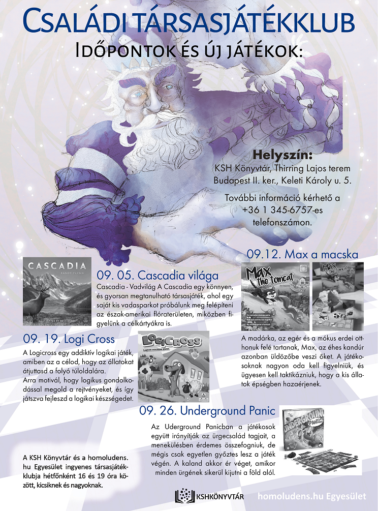 Ha hétfő, akkor társasjátékklub. A KSH Könyvtár és a homoludens.hu Egyesület közös rendezésű családi társasjátékklubja szeptemberben is várja az érdeklődő kicsiket és nagyokat hétfőnként 16 és 19 óra között.