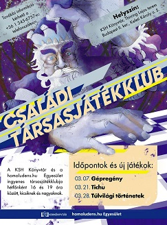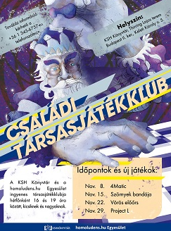 A KSH Könyvtár és a homolundens.hu Egyesület ingyenes társasjáték klubja hétfőnként 16 és 19 óra között, kicsiknek és nagyoknak.