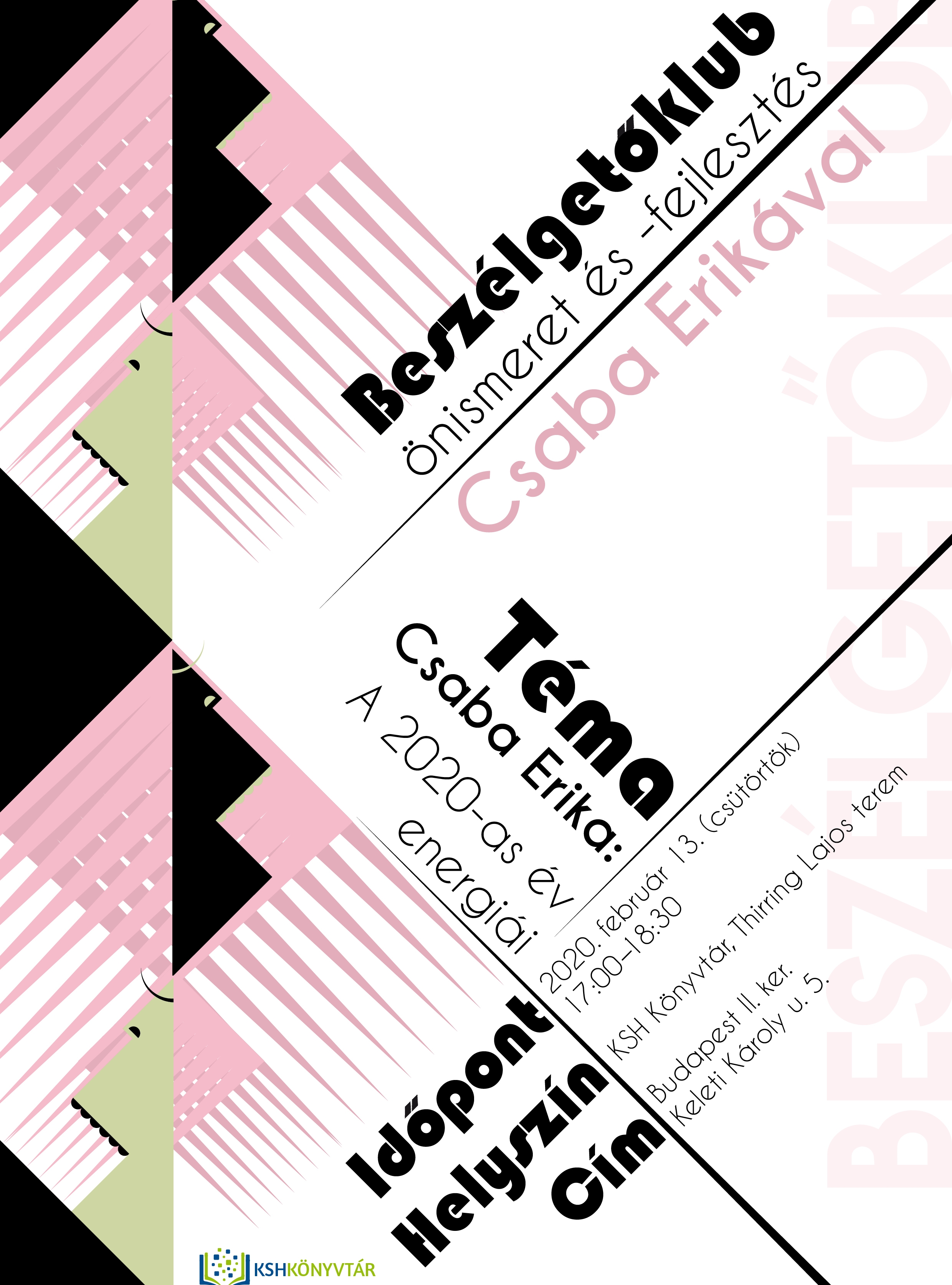 2020. február 13-án (csütörtök) 17 órától a KSH Könyvtár beszélgetőklubjának következő előadója Csaba Erika. Előadásának címe: A 2020-as év energiái.