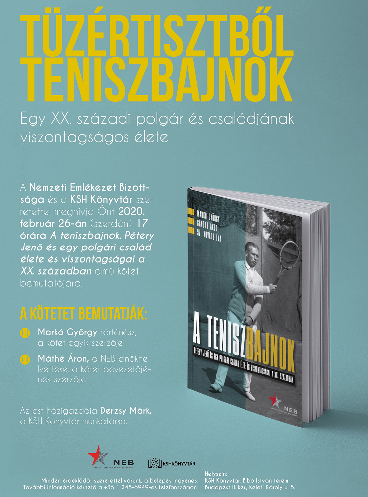 A Nemzeti Emlékezet Bizottsága és a KSH Könyvtár szeretettel meghívja Önt 2020. február 26-án (szerdán) 17 órára A teniszbajnok. Pétery Jenő és egy polgári család élete és viszontagságai a XX. században című kötet bemutatójára.