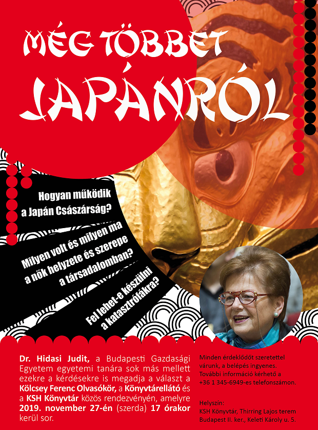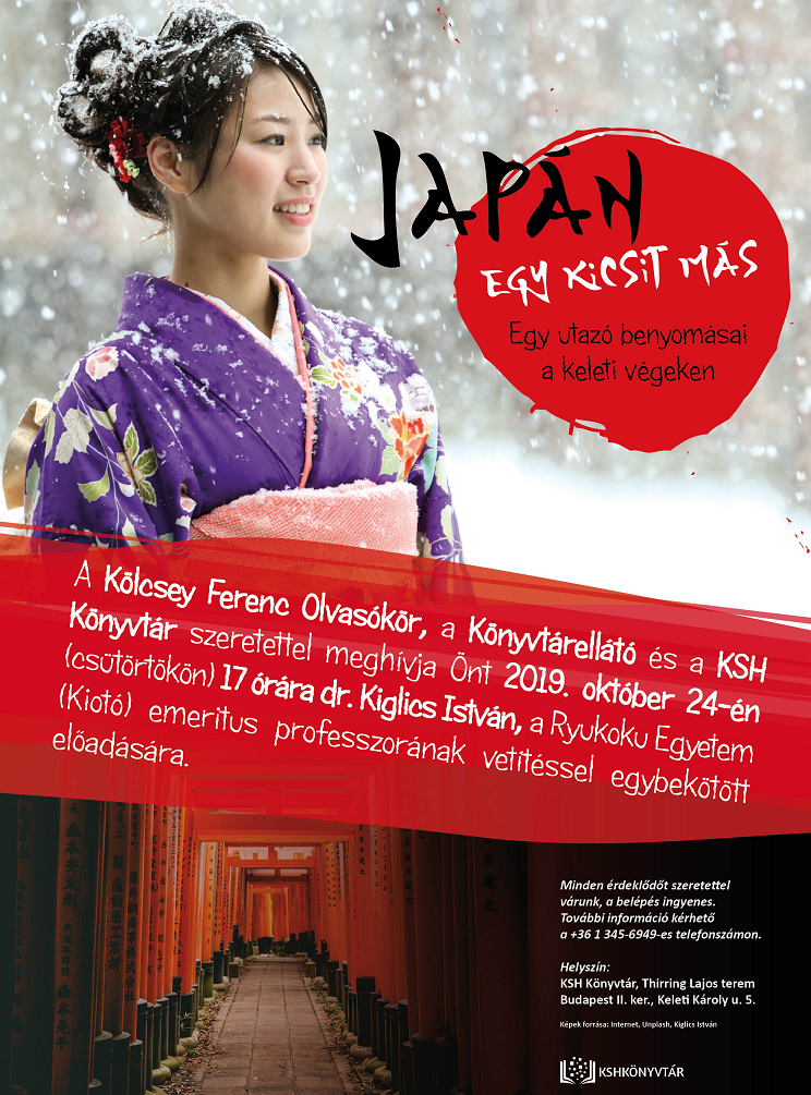 2019. október 24-én (csütörtök) 17 órától a Kölcsey Ferenc Olvasókör, a Könyvtárellátó és a KSH Könyvtár közös rendezvényén dr. Kiglics István, a Ryukoku Egyetem (Kiotó) emeritus professzora tart előadást Japánról. Az előadás címe: Japán egy kicsit más – egy utazó benyomásai a keleti végeken.