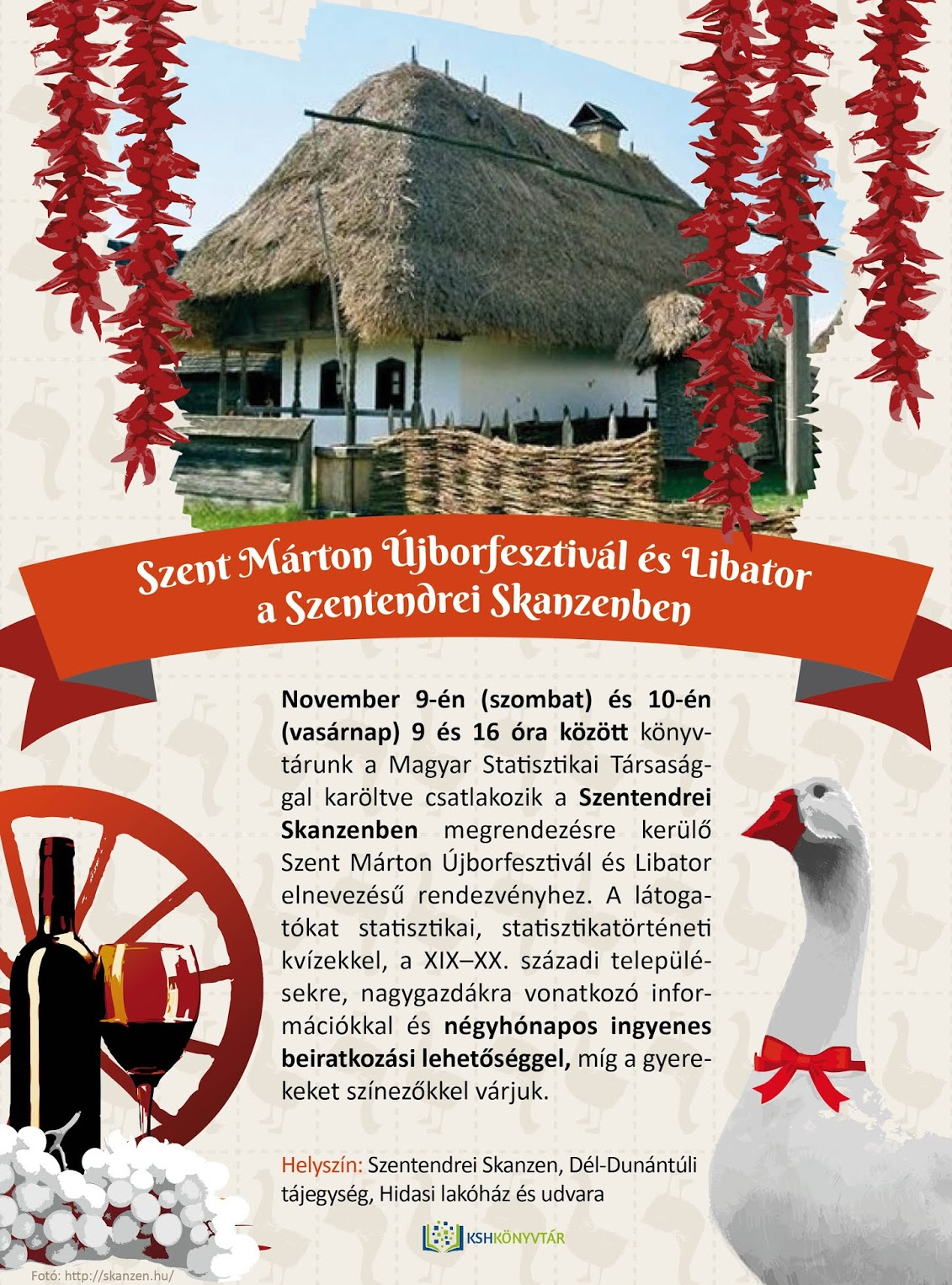 2019. november 9–10-én (szombat és vasárnap) 9 és 16 óra között könyvtárunk a Magyar Statisztikai Társasággal karöltve csatlakozik a Szentendrei Skanzenben megrendezésre kerülő Szent Márton Újborfesztivál és Libator elnevezésű rendezvényhez. A látogatókat statisztikai, statisztikatörténeti kvízekkel, a XIX–XX. századi településekre, nagygazdákra vonatkozó információkkal, és négyhónapos ingyenes beiratkozási lehetőséggel, míg a gyerekeket színezős játékokkal várjuk.