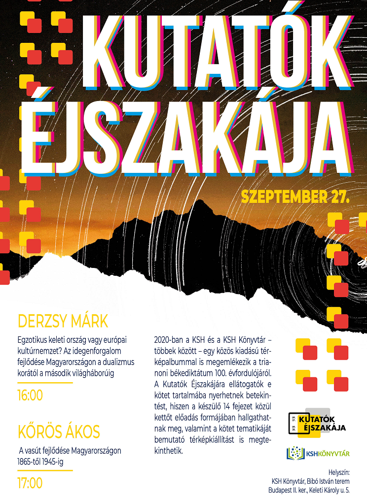 2019. szeptember 27-én (pénteken) idén is részt veszünk a Kutatók Éjszakája programsorozaton, amelynek keretében két előadást (Derzsy Márk: Egzotikus keleti ország vagy európai kultúrnemzet?; Kőrös Ákos: A vasút fejlődése Magyarországon 1865-től 1945-ig) hallgathatnak meg a könyvtárba ellátogatók.