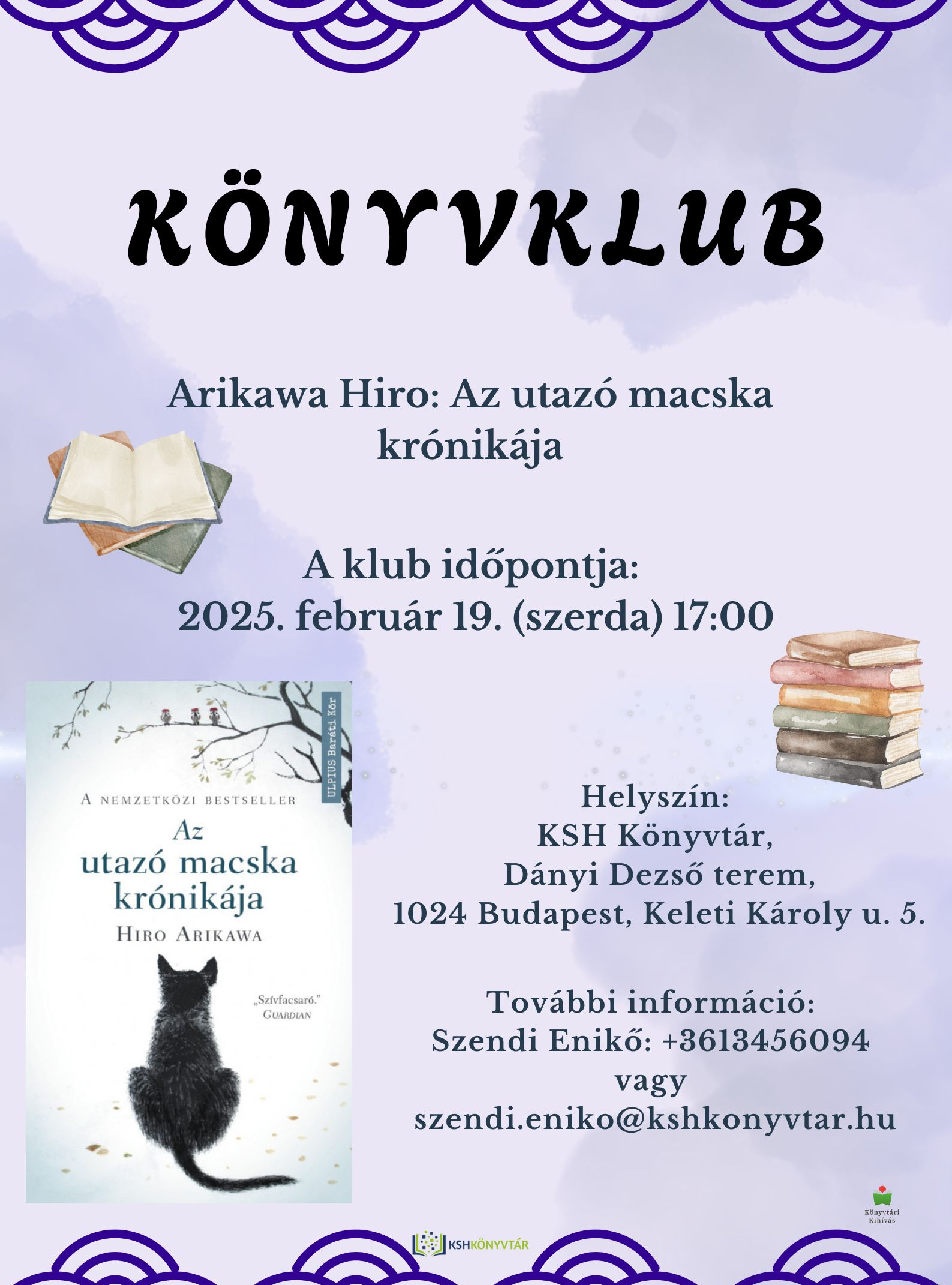 2025. február 19-én 17 órakor folytatódik a Könyvtár könyvklubja, a hónap témája: Arikawa Hiro: Az utazó macska krónikája.
